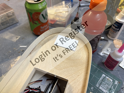 I did not have anything similar to the Speed 180 gearbox called for, so after I trimmed and sanded the hull I made up a motor mount for a 28mm outrunner. The motor Iโm using is a little hotter than I would like, itโs 750KV, which is not a โhotโ motor in any stretch but is a little hotter than I would have likedโฆbut itโs in my stock, so I used it. The shaft was missing from the kit, so I had an 1/8 in I.D Dumas tube and shaft that I cut down to suit. I have a few 3 blade props in the right size for this boat, theyโre set up for a drive dog or pin style shaft. They are made for a 3 mm shaft, so it was easy to clean out with a 3.2 (1/8) drill bit to fit my chosen hardware. I also am using a rudder from my parts stock, which I started to mount in the original location, didnโt like that so I moved it aft a bit to give a little more clearance for prop installation. The original hole is filled from the inside by the rudder tube support, the rest of the fill will be done later. After I got every thing ready I checked fit and alignment then glued every down. I then built up a servo mount and did a Buick install and test on the linkage, after that I glued down a battery floor.