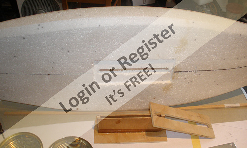 Next was creating the ply deck, then contact gluing onto it a piece of dense 50mm building polystyrene. This was then shaped with a surform file and the chines shaped afterwards using eyeometry. Then the 10mm deck foam was glued on so the deck sheer could be shaped.