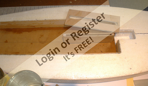Next the cockpit foam was routered out, and basswood sides and inner transom piece epoxied in. After that, the ply outer transom piece and hardwood nose block was epoxied on.