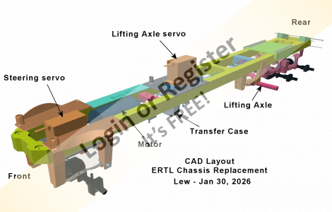 Right now I am working on the semi-tractor. The new unit will have another axle, this one to lift by RC. It will also have the extra sleeper cabin and other accessories. I am planning to make the "gooseneck" (the part that connects to the trailer) RC controlled. Unfortunately the model's lowboy trailer suffers problems like the real trailers do. Too close to the ground. I will need to elevate the trailer sufficiently so it will not get stuck. I do not have to contend with railroad tracks which makes the vehicles good targets for fast moving trains.