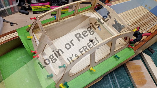 The superstructure has been started. Iโve got the aft bulkhead, aft bulkhead outside fairing doublers, cockpit and windbreak installed. At this point I have to measure the drawing on the plans to mark the windows, then tape 2mm strips in position, glue the strips and uprights at the window locations, cut away the unglued excess strip, then cut the windows out. Iโll probably get the locations marked this week, and get the horizontal strips taped down, then wait till this weekend to finish that job.
