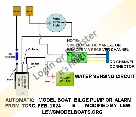 Nice one Lew. This is just the sort of thing I wish to install in one of my boats. At present the pump is operated by a switch controlled by the transmitter, and it is complete guess work as to whether the bilges need pumping or not. ๐