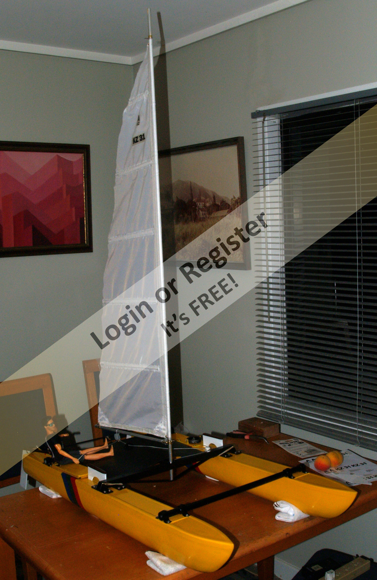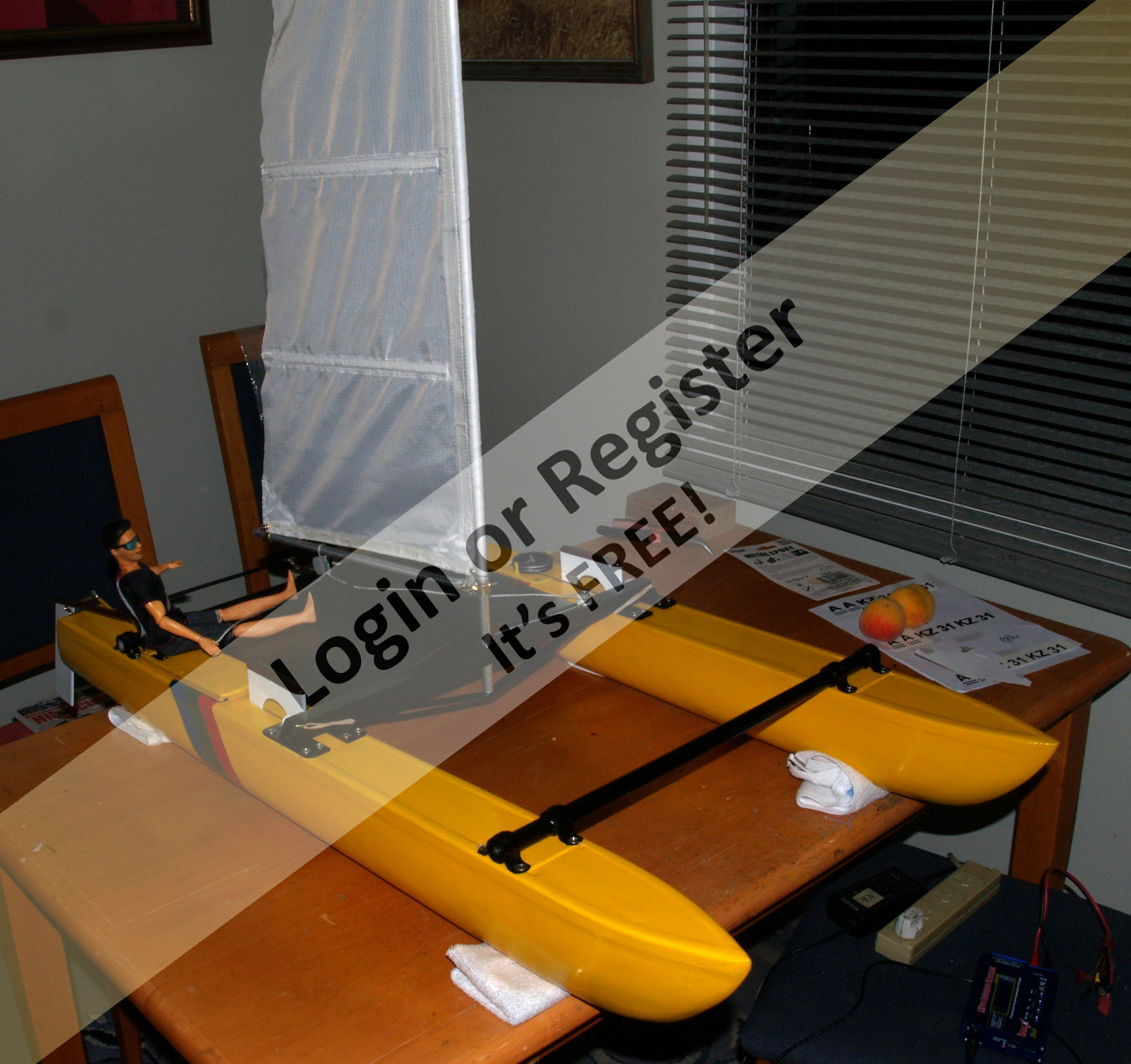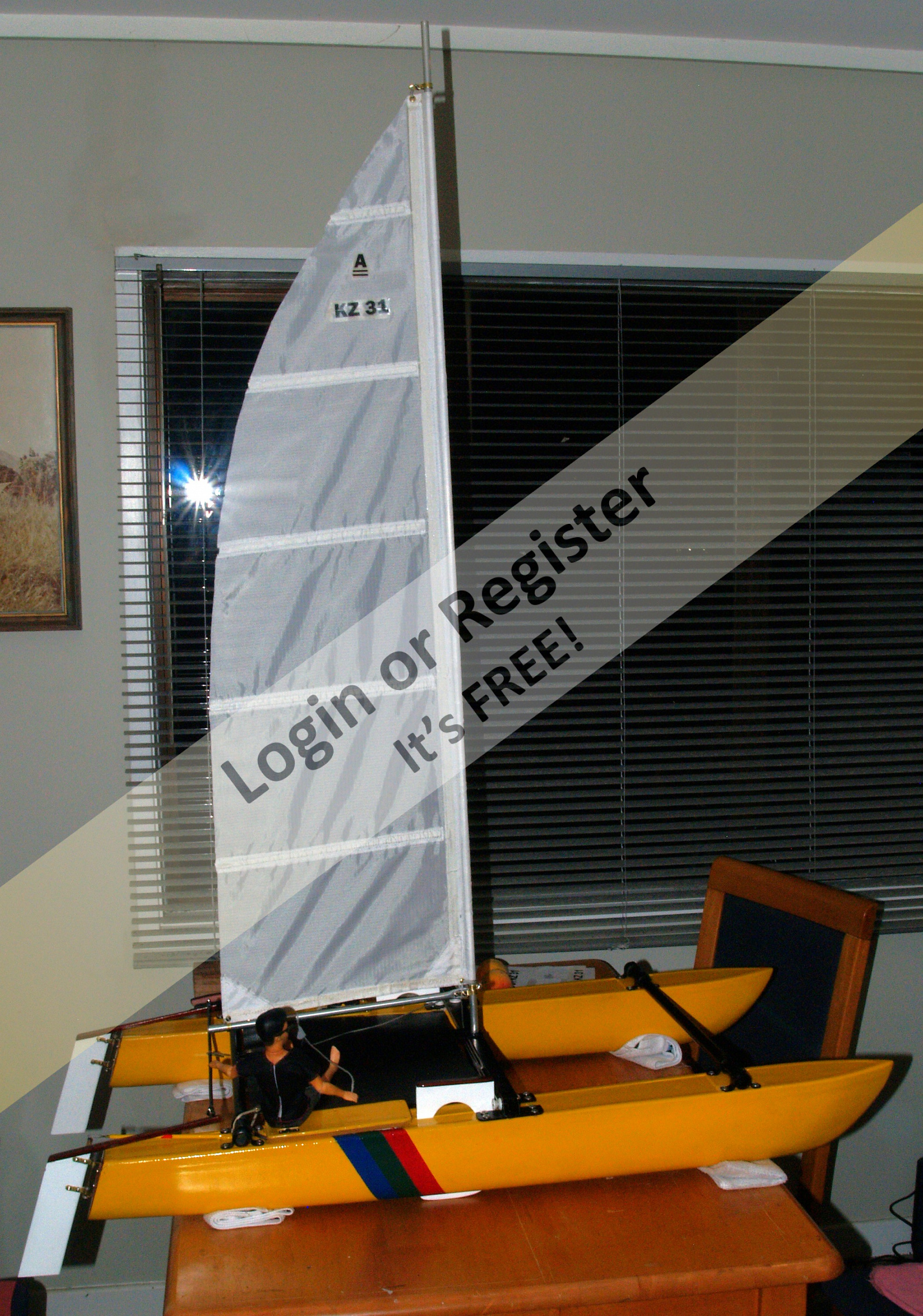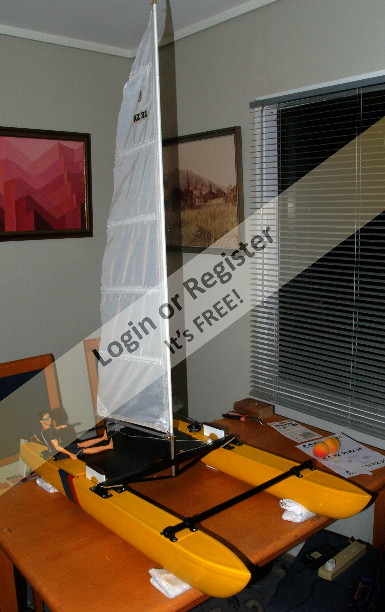 Beautiful work and the videos where you show it sailing, have motivated me to try to build one of these catamarans. A few questions: 1 โ when you say that you started working on a 1 meter catamaran; do you mean the sails of an IOM? 2 โ when you talk about an 18-foot "Hustler MK2" "Class A" catamaran designed by Ron Given, do you mean the size of each hull of the catamaran? 3 โ That's about 5.59 meters of hull... did you build it in any particular scale or based on the size of the sail? 4 โ The dummy you used (very accurate, by the way), what scale is it? Thank you very much. I will follow your work and I hope to overcome some health problems (typical of Spanish winters) to be able to start building something like this. ▲