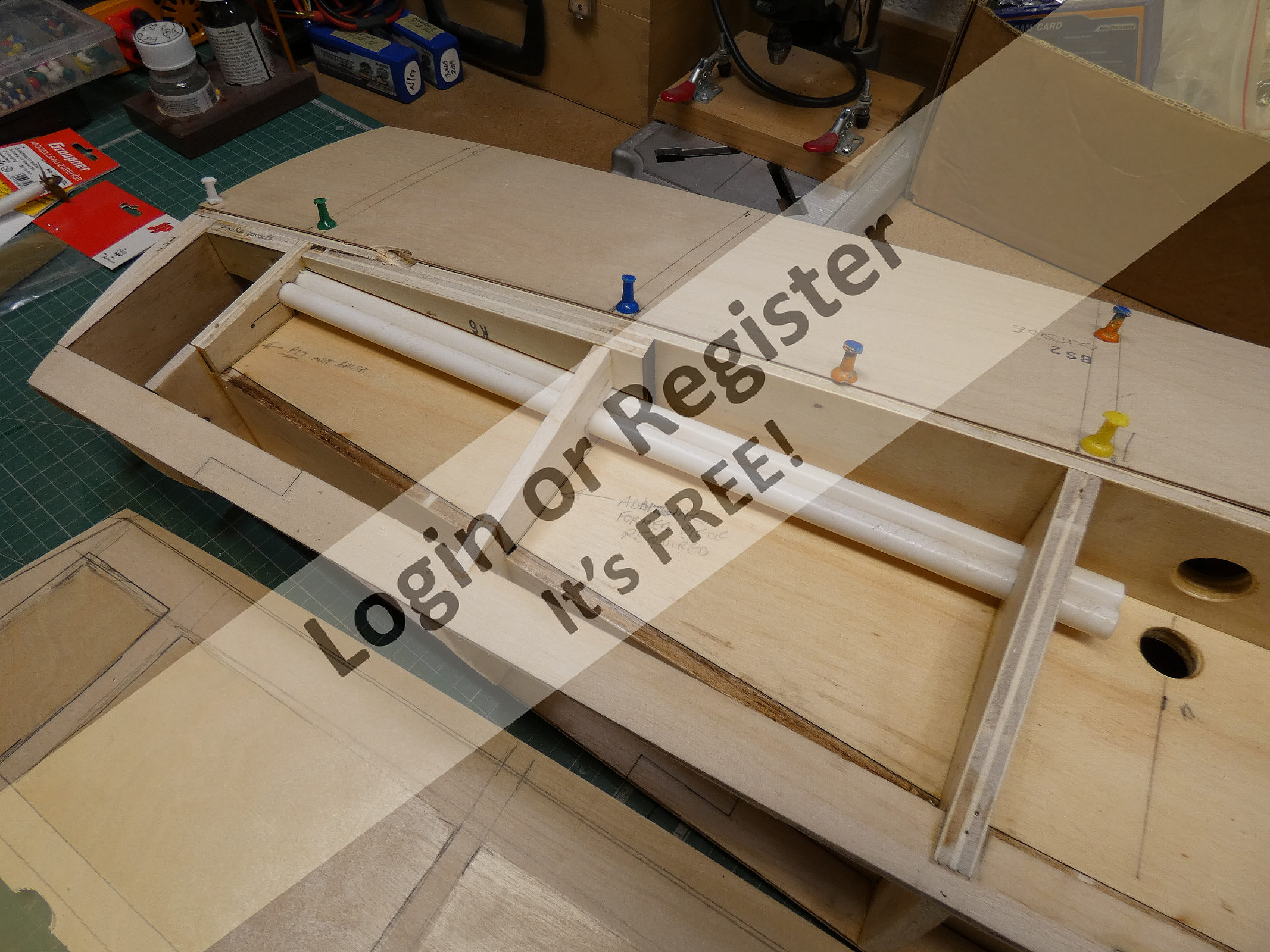 I see you are pushing them into wide plywood frames. Those thick plywood frames will make the boat heavy thus requiring a strong motor to move the model along. I built a Norstar kit that used those thick frames, but that kit was designed for a gas powered motor not an electric style used today. If I were to make that model again Iโd be making it with light frames. Getting back to your question about metal tipped push pins. Try a business supply store. Or woodworking shops have long necked adjustable clamps that will not damage your project if used properly. ▲