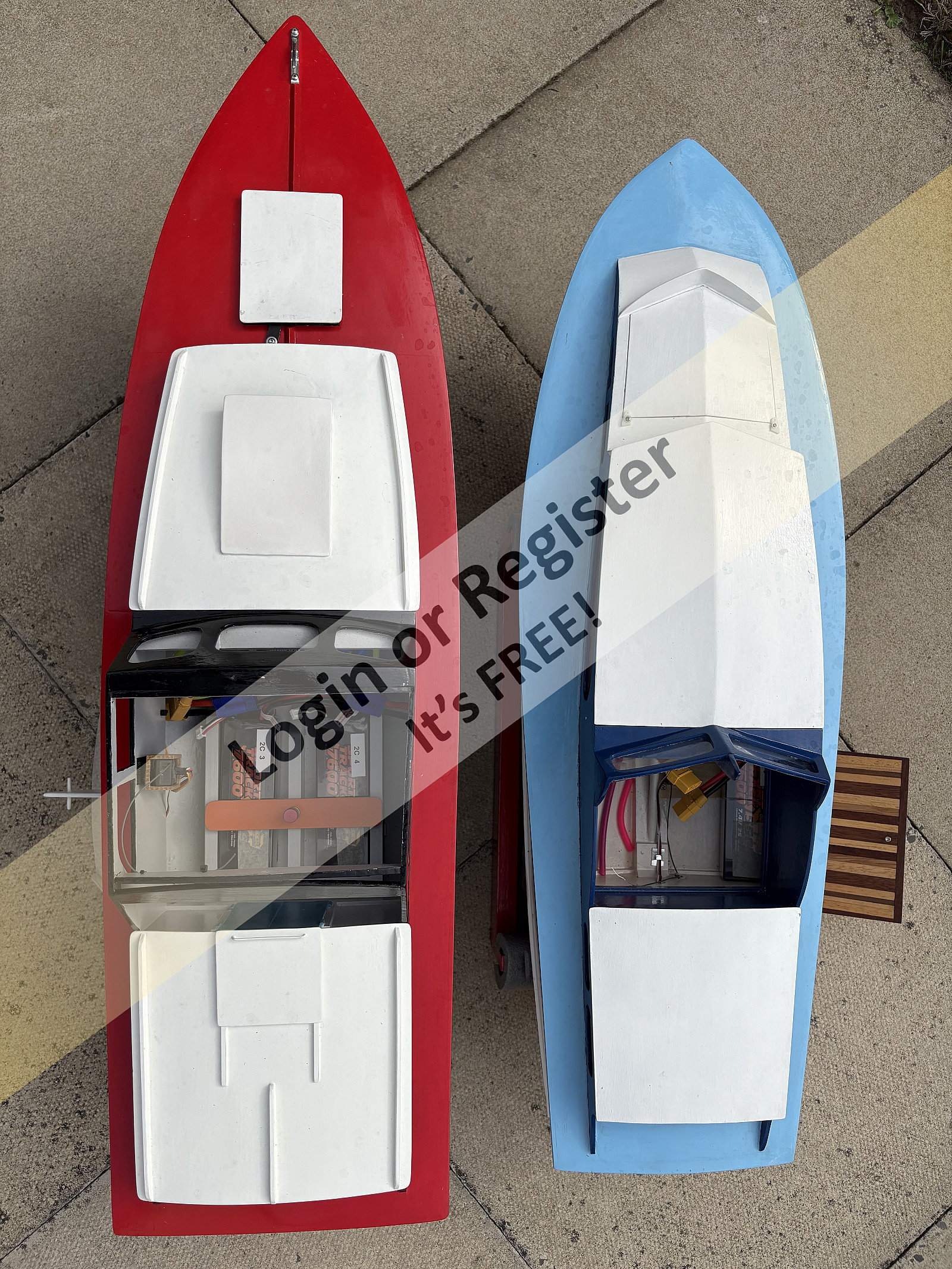 The larger boat on the left is my 39โ Rapier and the smaller boat on the right is my 34โ Kopy Kommander. Both boats have their cockpit floors removed following their runs (for a change of battery) when their comparative hull shapes become quite clear to see. I know that one hull has a deep vee and the other does not, but it still makes an interesting comparison. Bob. ▲
