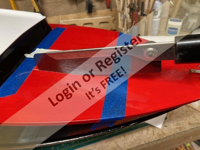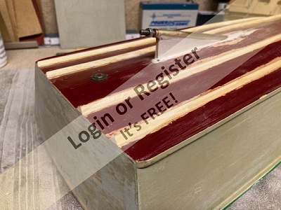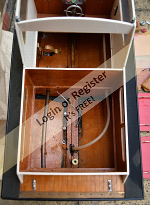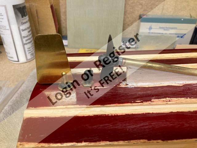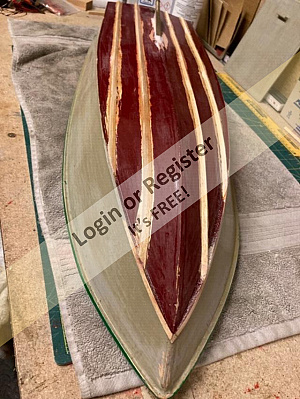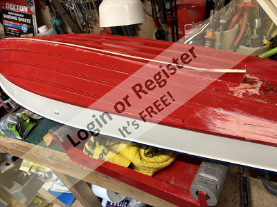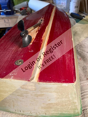 As these strakes were retro-fitted to an old hull, I thought these pictures of the hull being prepared to take them could be of some interest as strakes can be fitted to any old Classic Model Power Boat hull that never had them fitted originally. The position of the strakes was marked on the hull and then a narrow chisel was dragged along these lines to remove the paint and expose the plywood skin ready to have the hardwood strakes super-glued in place. A new rudder and water scoop was added and the new M5 prop-shaft was given a support and faired-in to the keel. Fortunately this hull was old enough to have a proper brass rudder fitting assembly and the current modern rudders still use the same size pivot shaft axles, so I did not have to fit the moulded plastic mounting kit that came with the new rudder. Itโs a shame that it wasnโt fitted with a brass water scoop and outlet as well, so a moulded plastic set has been fitted . Bob. ▲