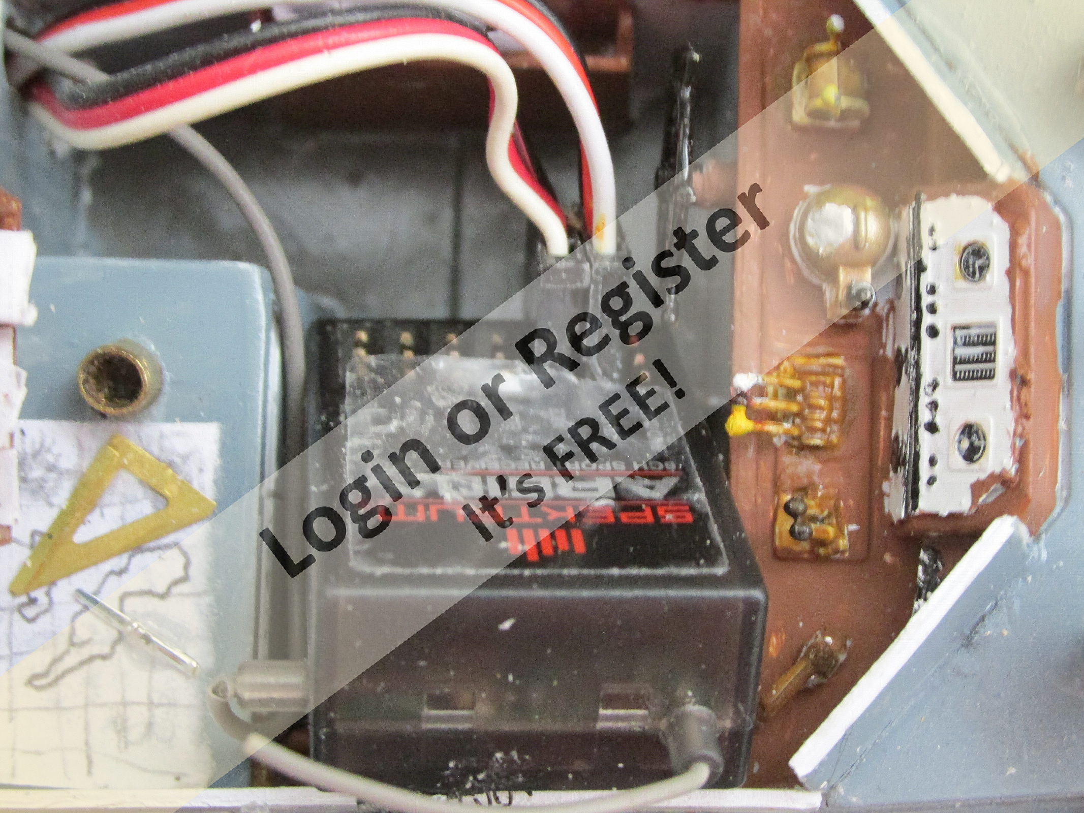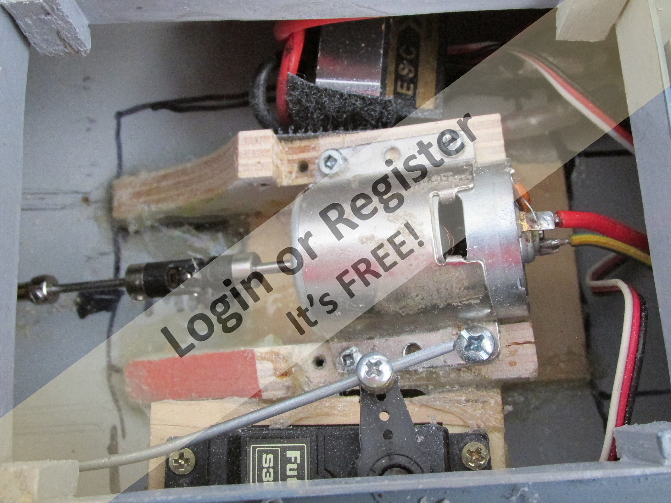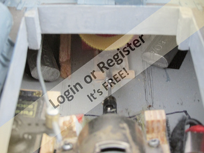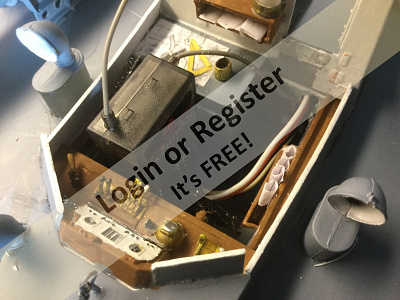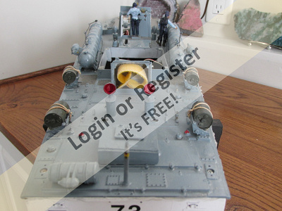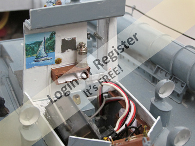You can see the yellow Velcro strip just above the prop shaft. This strap holds the battery; you can see more of it inside the companion way in photo two. It is using a small, 7.2v NiMH 1200mah battery I added coaming to parts of this model, not knowing if water would spray up on the deck when underway. Now after building it and running it in various ponds, the hull design disperses the water very well. If I were to build it again, I probably would alter the height of the coaming. ▲