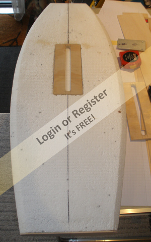 A rebate in the bottom of the hull was routered out for the lower c/board brace. These braces are needed to form part of a box structure with the floor and cockpit sides which the c/board can lever on. Once everything is eventually glassed in, it will make it very strong unit, so the foam will just be the shape surrounding the box, and not having any strain put on it. The ply deck will take the strain of the stays/mast.