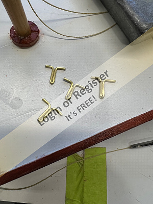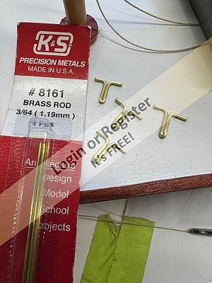 After identifying, numbering and gluing the frames together, you will need to cut and glue fourteen pieces of 3/32" square walnut stock to create the horn-type braces that will later support the bulwarks (the plank height).
