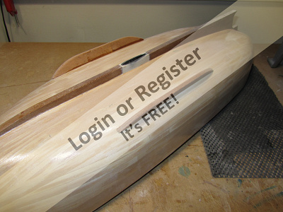 Next the cockpit foam was routered out, and basswood sides and inner transom piece epoxied in. After that, the ply outer transom piece and hardwood nose block was epoxied on.
