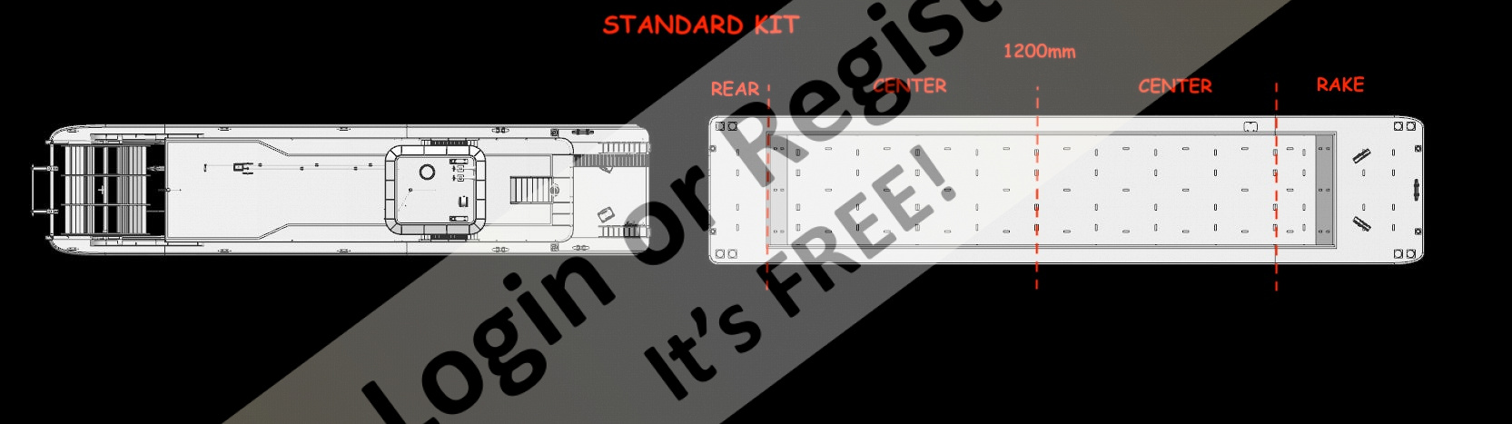 Standard kit 1200mm. Consists of rake, center x 2 & rear sections. Center kit 400mm. Used for longer or double ender barge. Rake kit 250mm. Used to make double ender.