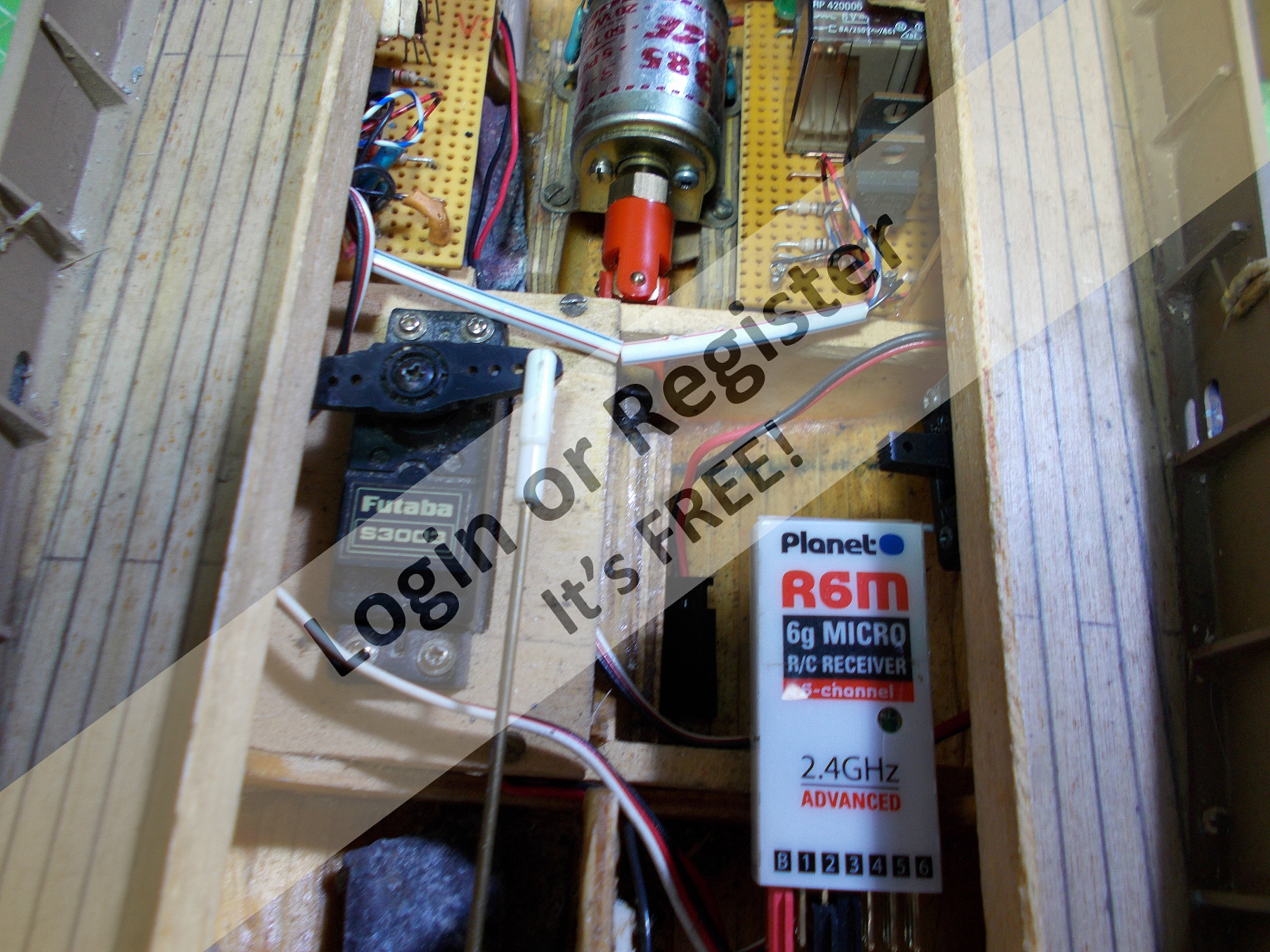 Just to give you some idea of what can be achieved with the internals of the boat, without removing the deck - these models require a small amount of power to push them along at quite a speed. So, in this model that I built there was a 385/400 MFA motor driving a 35mm 4 bladed brass prop. I used (I think it was a 7.2 NiCad battery). Bear in mind this model was built in the 90s - the weird looking circuitry either side of the motor on the strip board is an actual home made speed controller. As you can see, there is a standard servo which I fitted and a miniature receiver. There is also room for a power supply of 4.5 volt for the radio gear.