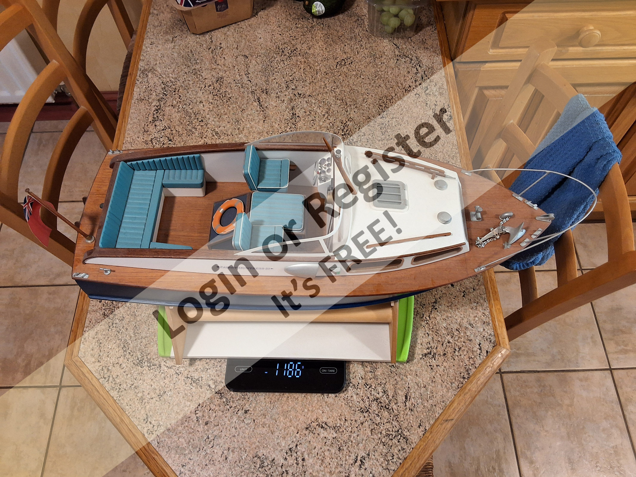 Talking of weight, out of interest I weighed the model of the Fairey Huntress that Dave Milbourn built and it came to 1186g plus the battery giving 1409g. Full size weighs around 2500kg which for 1:12 gives a scale weight of 1446g (2500/(12x12x12)) which I found surprisingly close given that the full-size has a heavy diesel engine etc. The weight distribution would be completely different though with the motor sat further back and with fuel tanks and freshwater tanks etc.