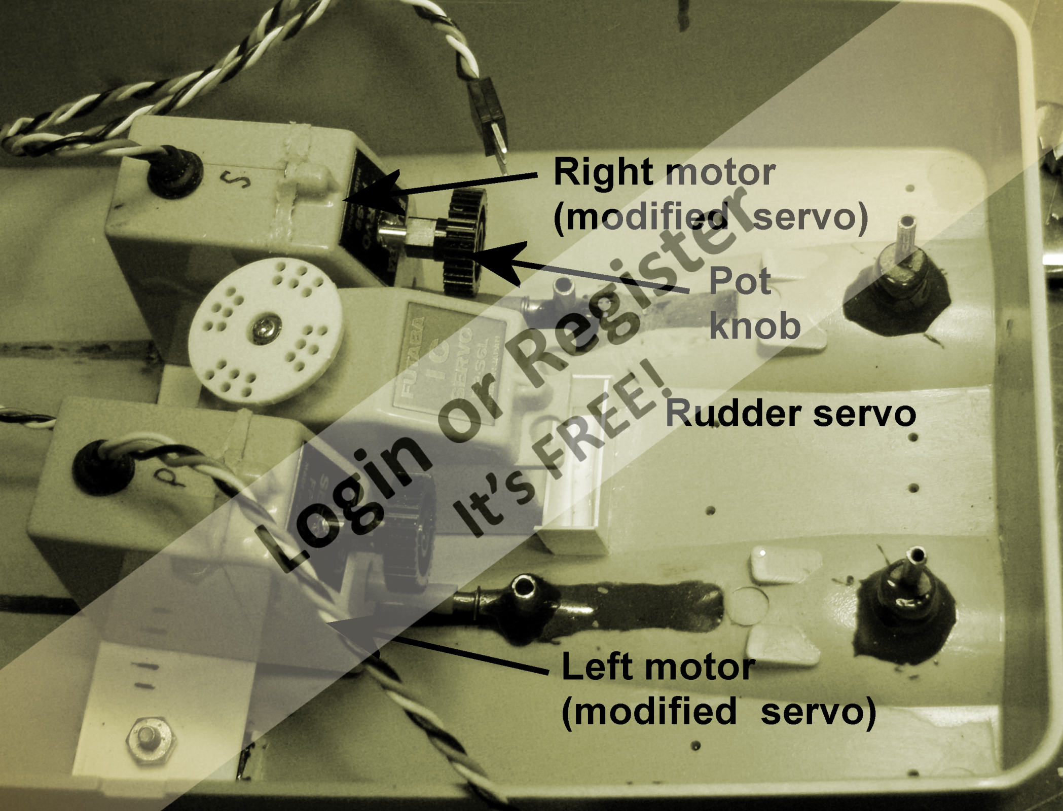 Years ago I modified two old servos to into inside my 1/35 scale LCM (see photo 1). By removing the limits and the gears between the motor and the potentiometer I was able to use the output shaft and connect to the prop shaft. This setup gave me forward, stop, and reverse and a variable speed to each drive (two shafts).