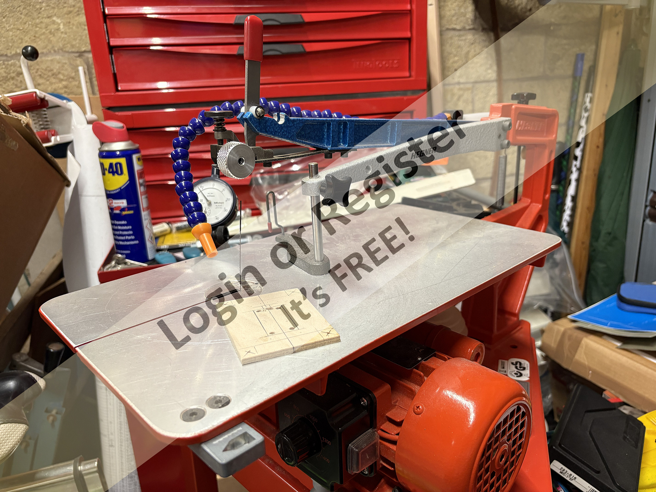 Due to its limited use, the Hegner jigsaw is kept on its cast stand in the garage where it can be easily accessed when needed, but is not taking up valuable space in my crowded workshop (shed) where it would be in the way most of the time.