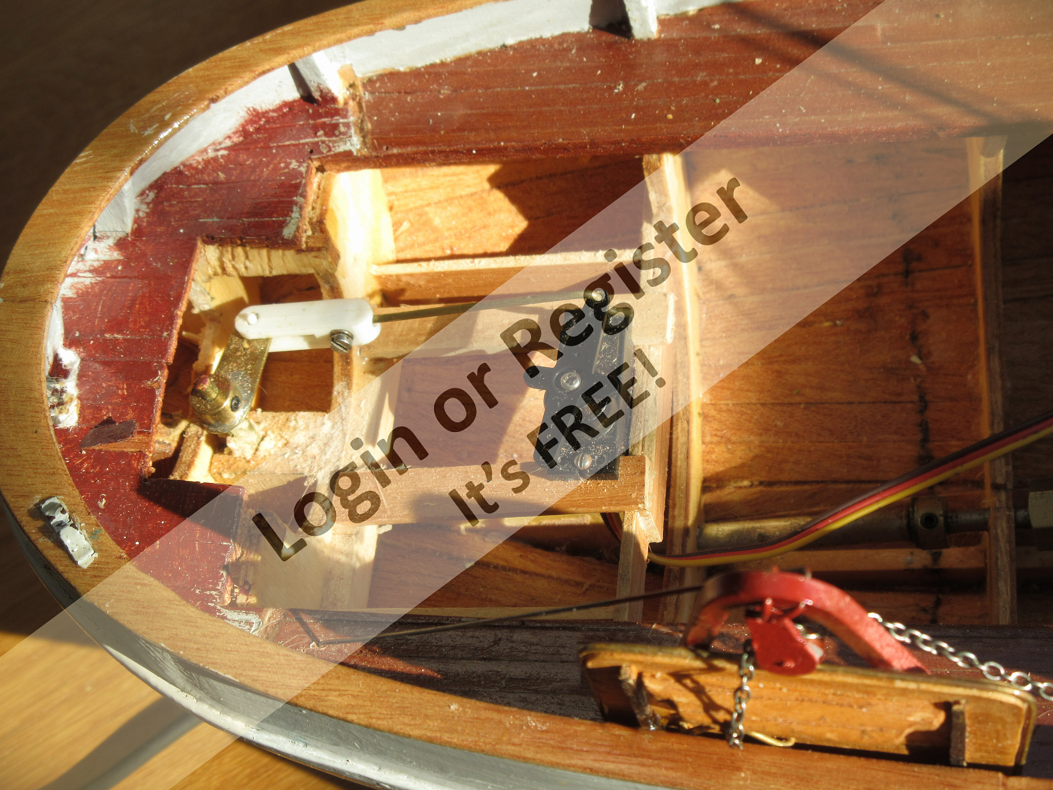 The rudder can be operated by a 9 gramme servo. The deck opening for batteries, motor and radio are best made before inserting the deck.