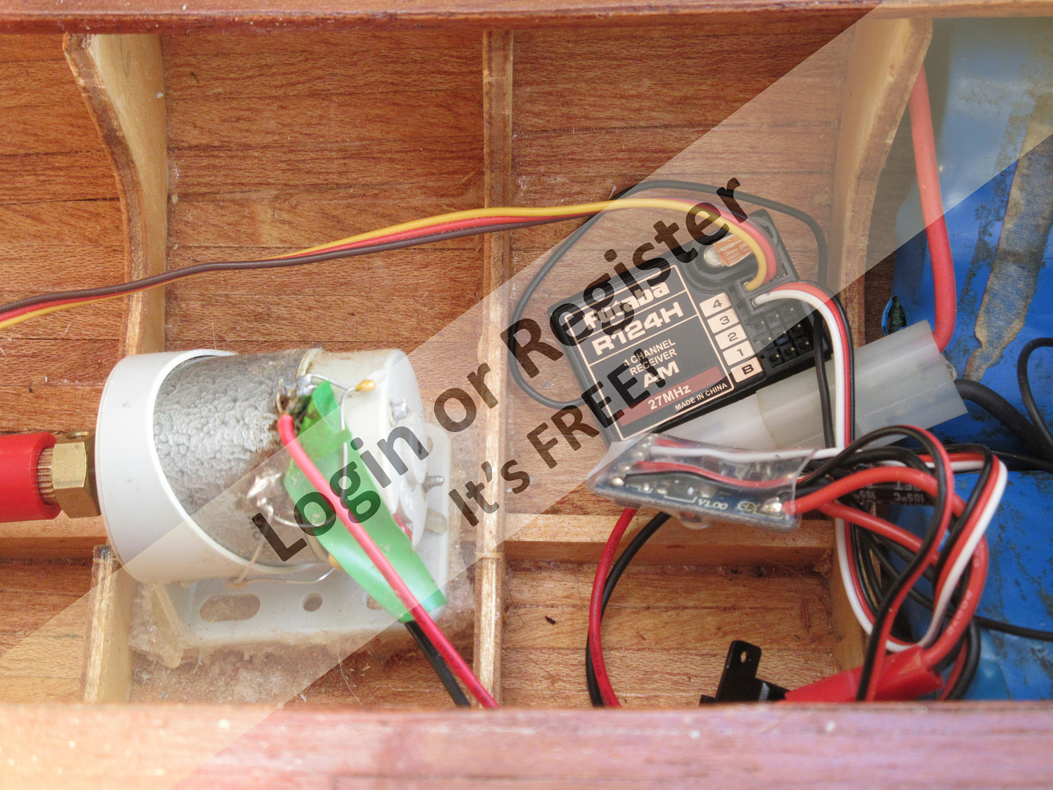 I use a special shape 6 cell sub-C nimh pack in 2 off 3 cell, side by side units under the main mast, if you use LiPo then some extra ballast is needed. Full speed at 1 amp on 7.2 volts works nicely.