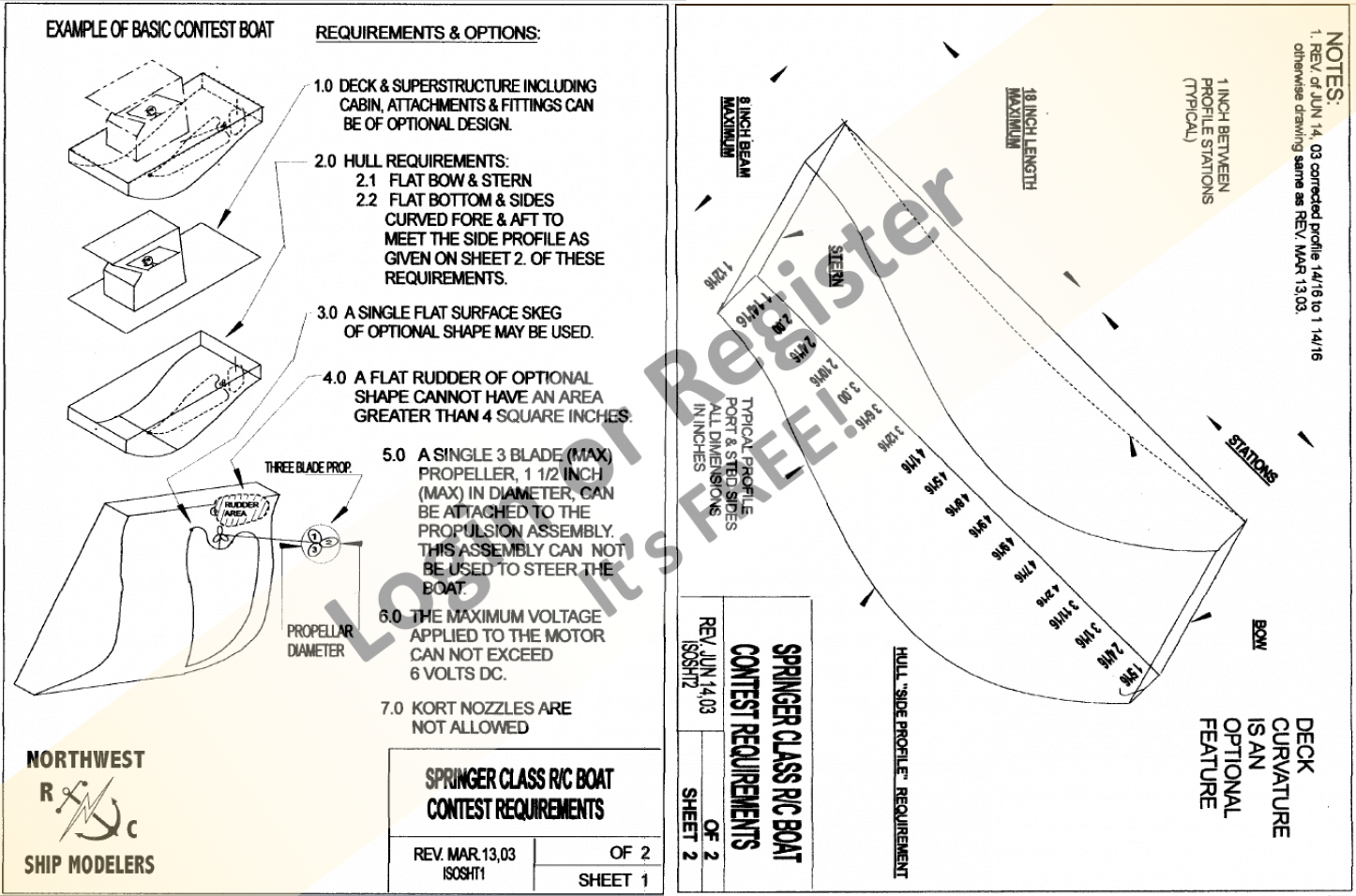 In my opinion some of the rules are nonsense. Take for example the 6V battery. 7.2V hobby batteries are quite common, much more that the 6V wet or dry cells. Being the builder has the option to change the gearing and there are so many different motors out there the only thing would be to have a sensible limit on the voltage. Same with the flagpole on the stern. One particular item is the dimensions for the push knees. Being I build my springer to scale I follow the design of the real boat. I'm sure there are a few other quirky rules as well.