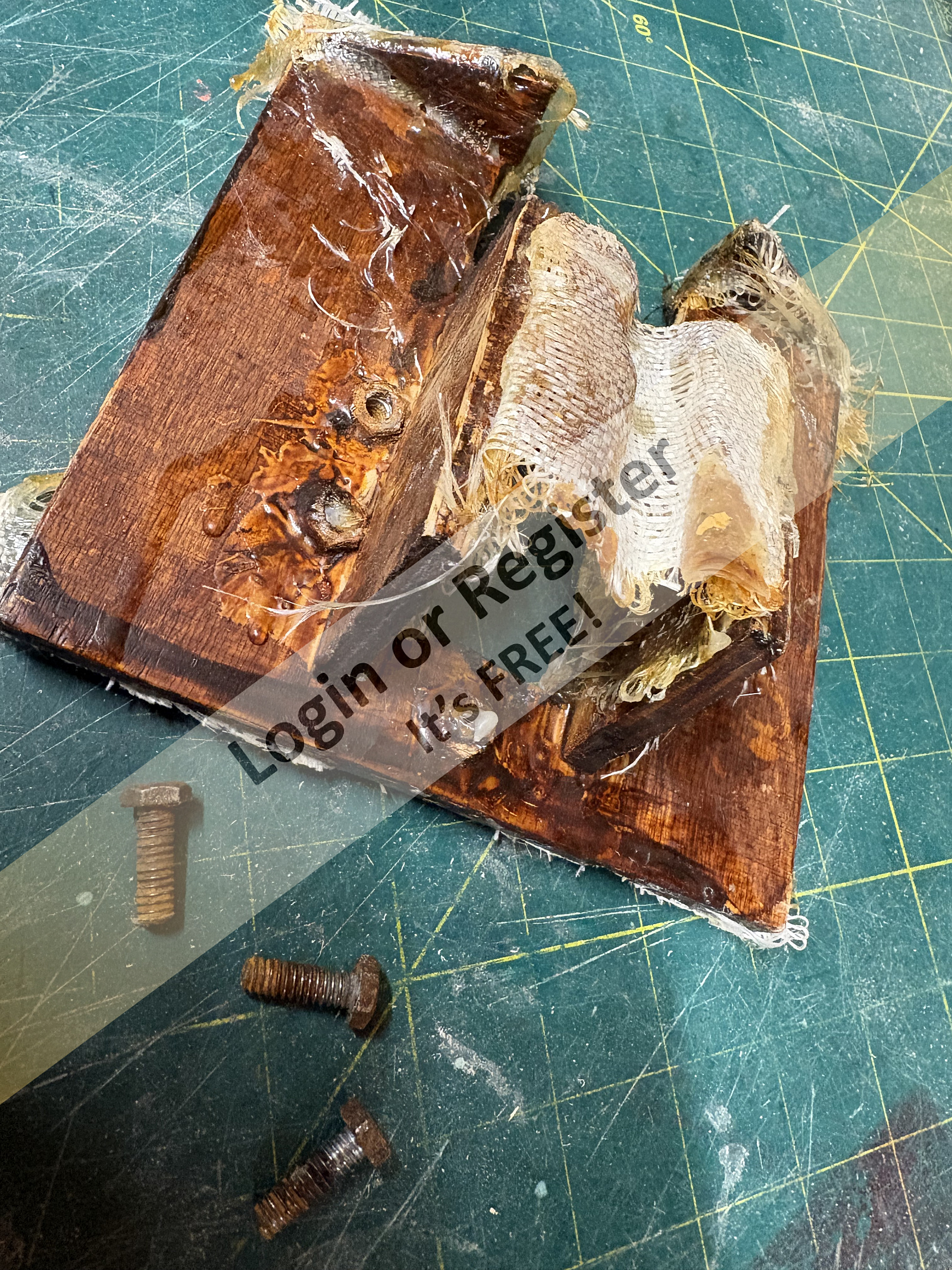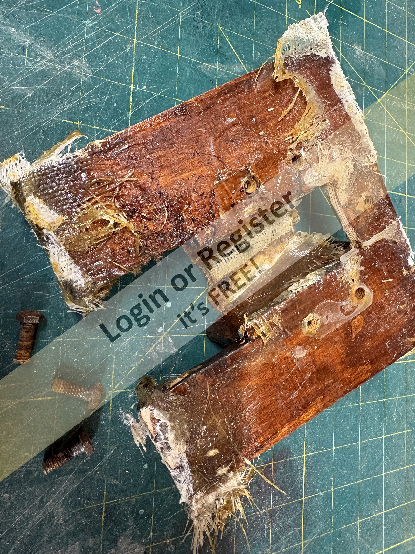 The (removed) heavy wooden engine mounting plate was pictured just before being consigned to the bin to show how little of the woven glass fibre tape had been 'wetted" to make a good secure bond to the hull.