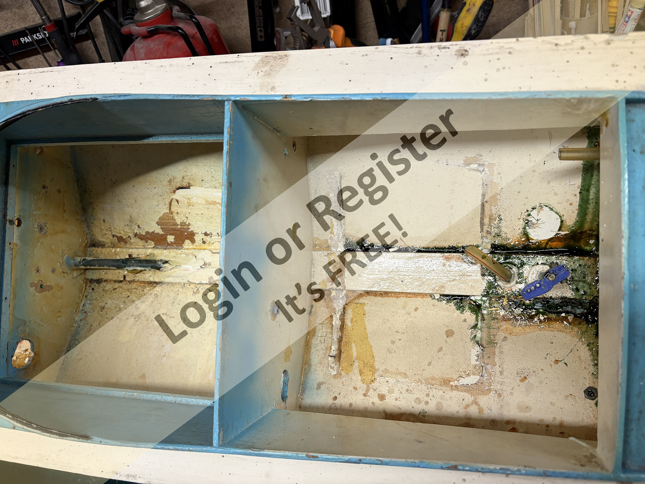 No signs of rot or fuel soaked wood suggests that this boat was seldom (if ever) run with the Merco 61 glow engine in it.