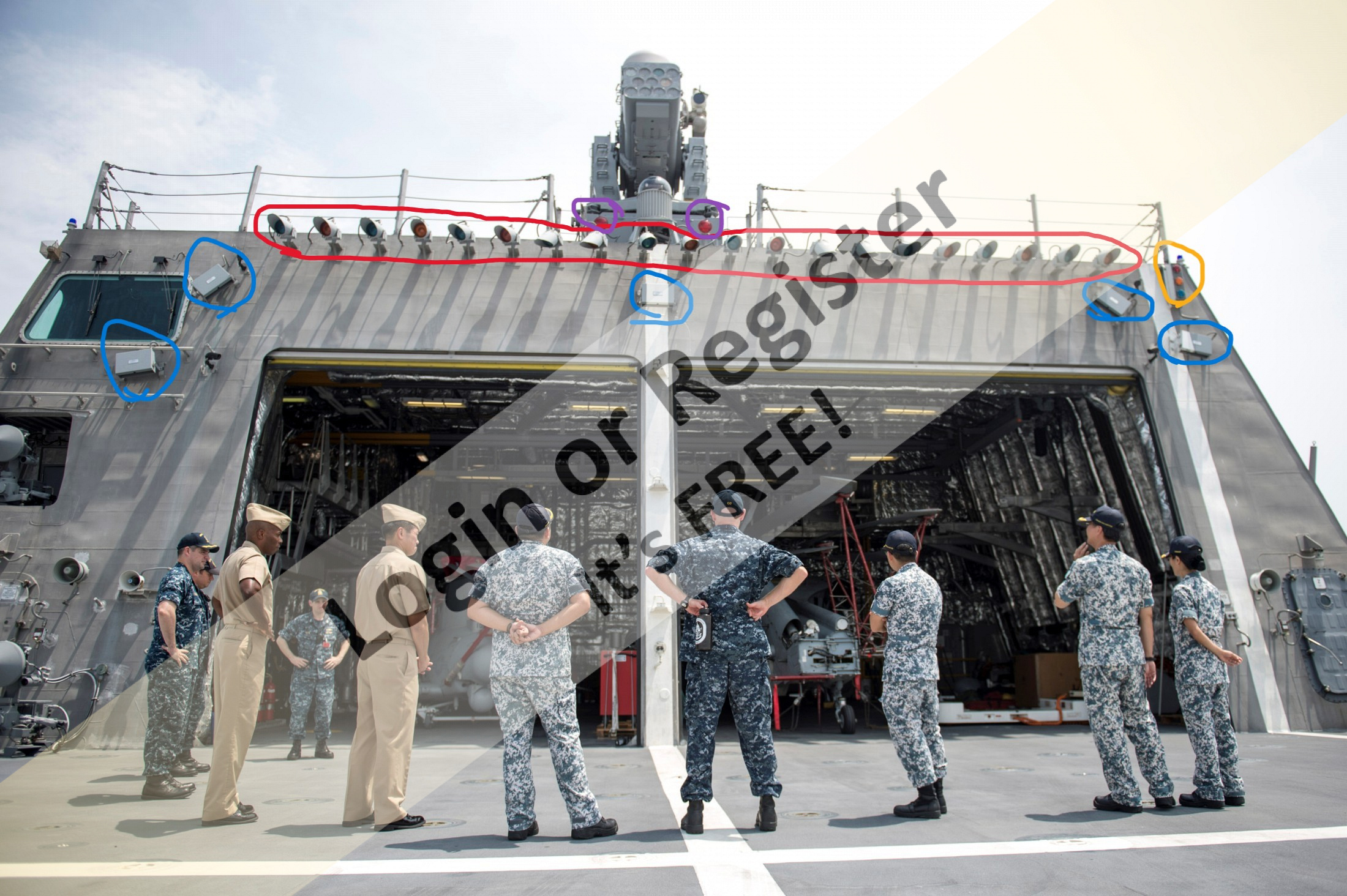 There's also a traffic lighting looking thing circled in orange (and on the corner in the circle that could be another light?) and 2 red lights up top circled in purple.
