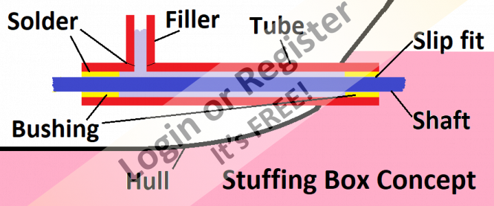 My preference is to have a fairly large sealing area. For example, using the attached drawing, the two ends where the shaft slip fits into are each about 5/8 inch long leaving a long void between the shaft OD and the tube's ID. [EDITED: this area is filled with the sealant lube.] Thus I have no problem with leakage when the entire shaft is below the waterline. Lew Florida โฑ๏ธ, USA ๐บ๐ธ ▲