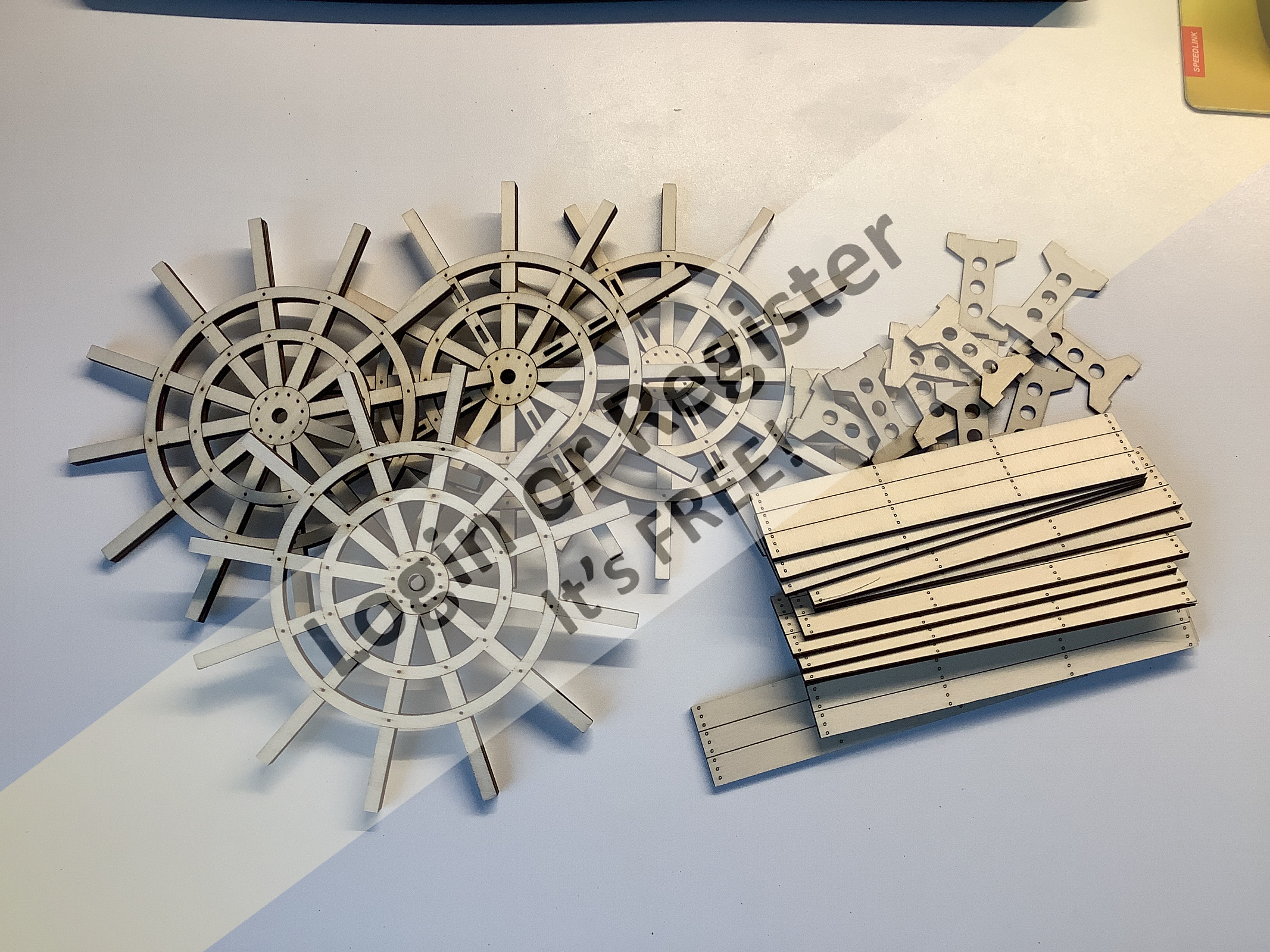 Start tonight, gather goods, arrange plans and copy. A lot of preparation for a clear process. . . Here is the first hurdle: The rear wheel. Enclosed are a few impressions of my start. The aluminium blade plates are not 100% correct, even with laser-cut parts you have to add something to the measurement, but even this is often not enough. In addition, I am still waiting for my laser plotter / cutter. It just doesn't want to come to me ... Wait and see. Hobbyist greetings Michel-Cl. PS: The 2nd photo is a pattern with a real rivet. This is how it should look in the end ▲