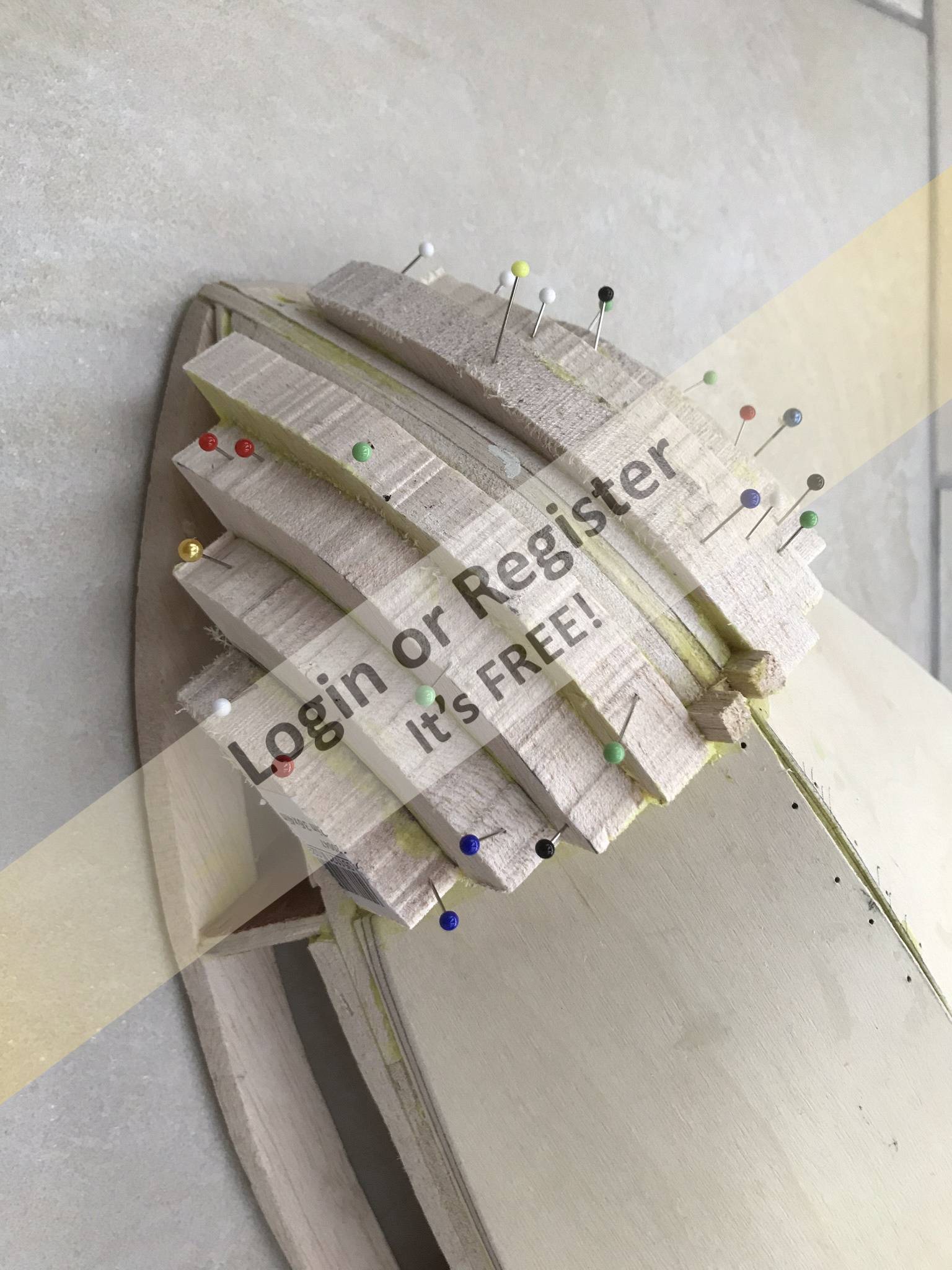 The plans are a bit fragile now, but were still good enough to make some templates from old cereal boxes (and any other thin cardboard box that was being thrown away for recycling at the time!). I drew around these templates to make the keel and bulkheads from birch plywood and cut them out on a bandsaw. Everything was then assembled using aliphatic glue. ▲