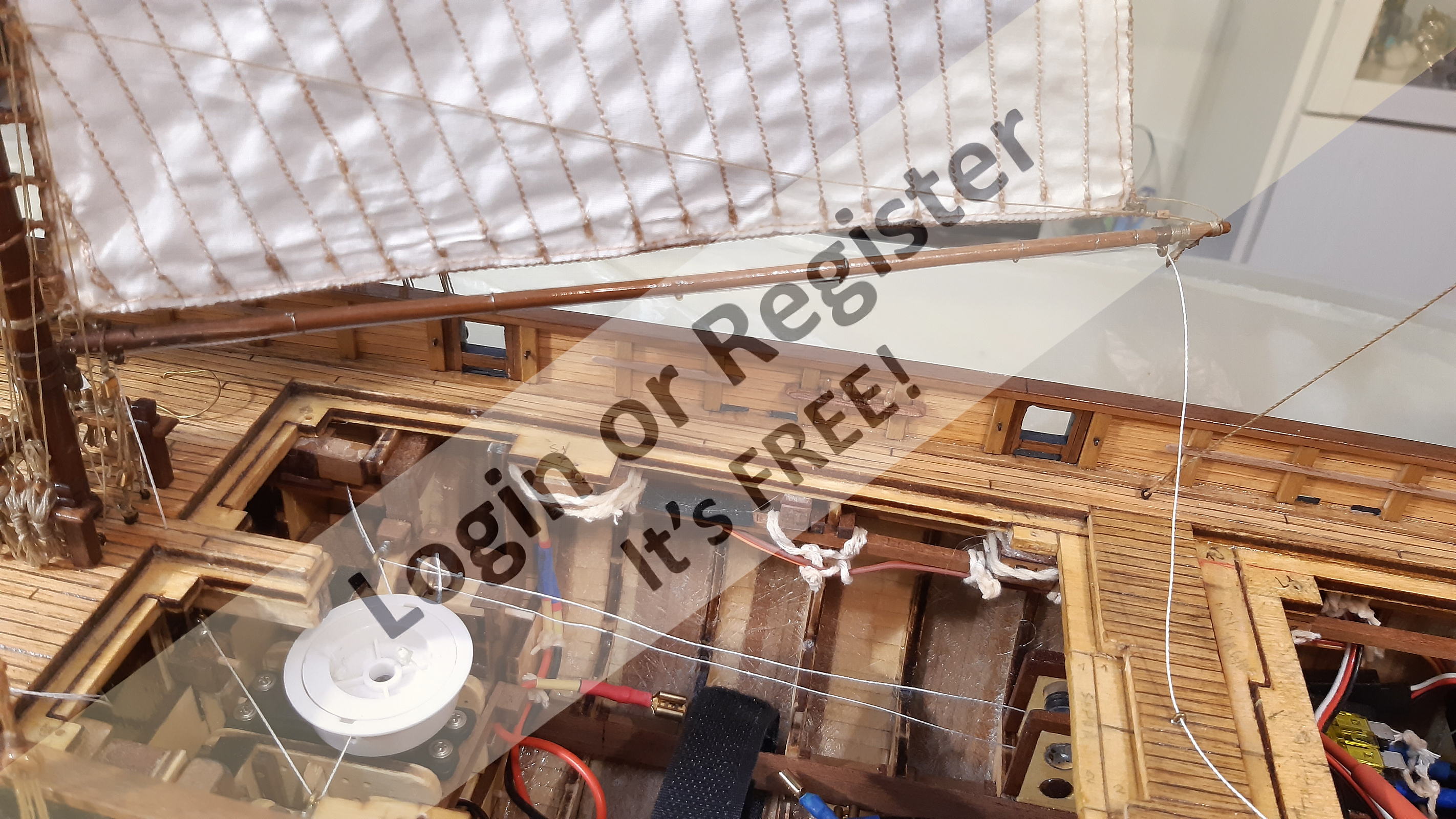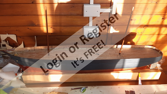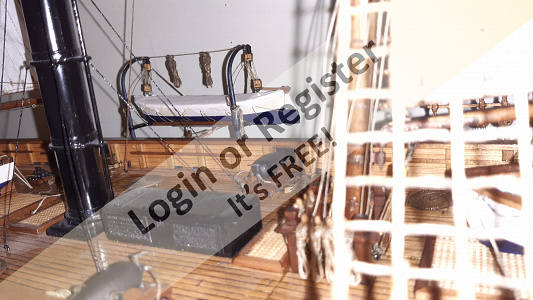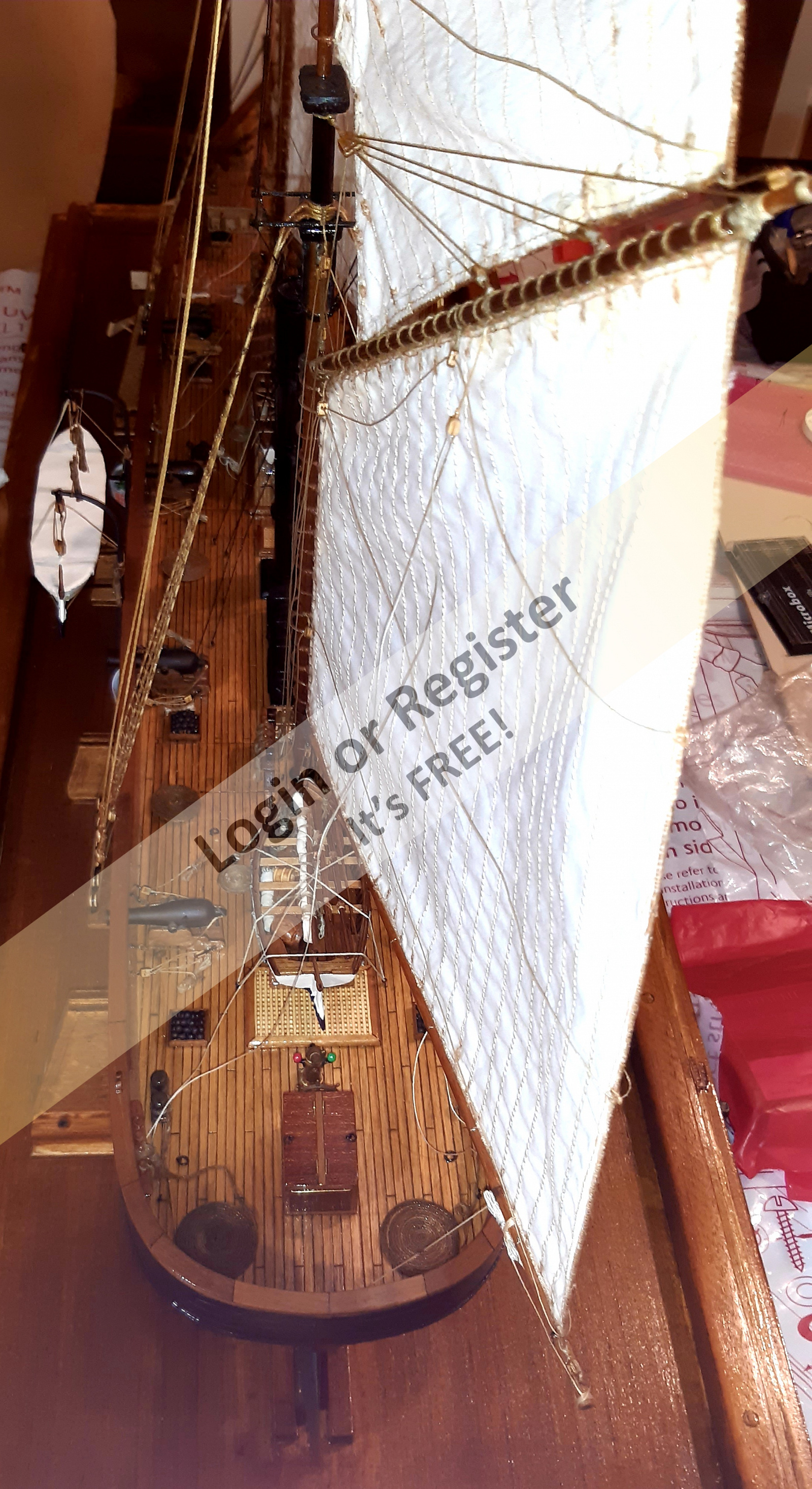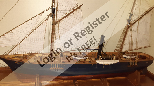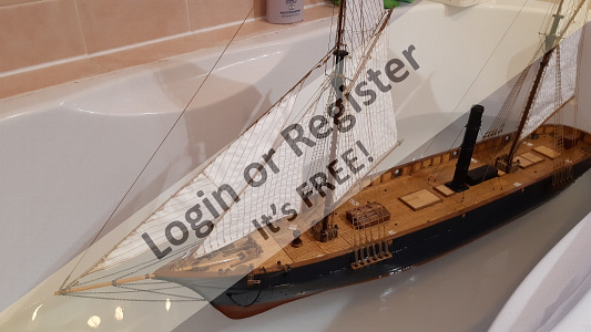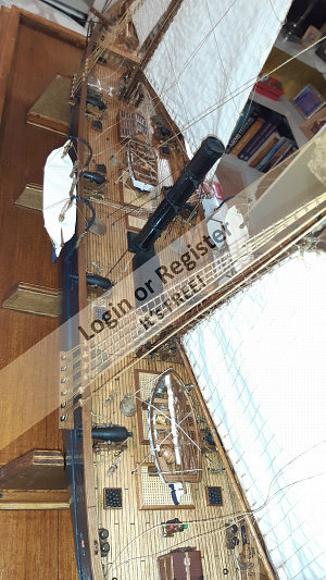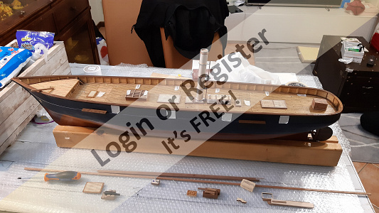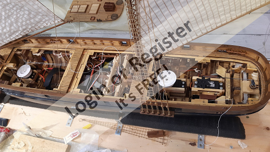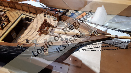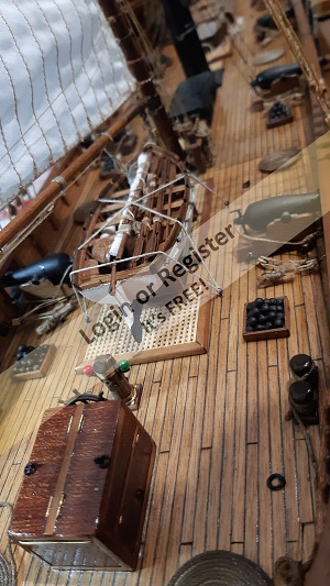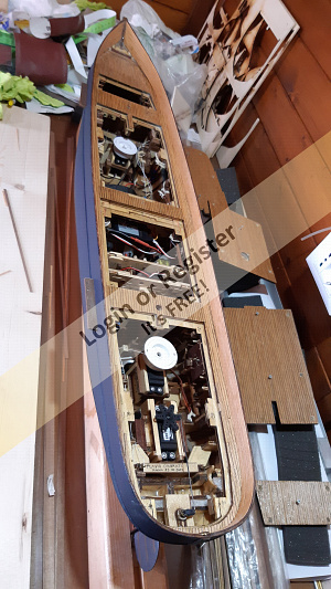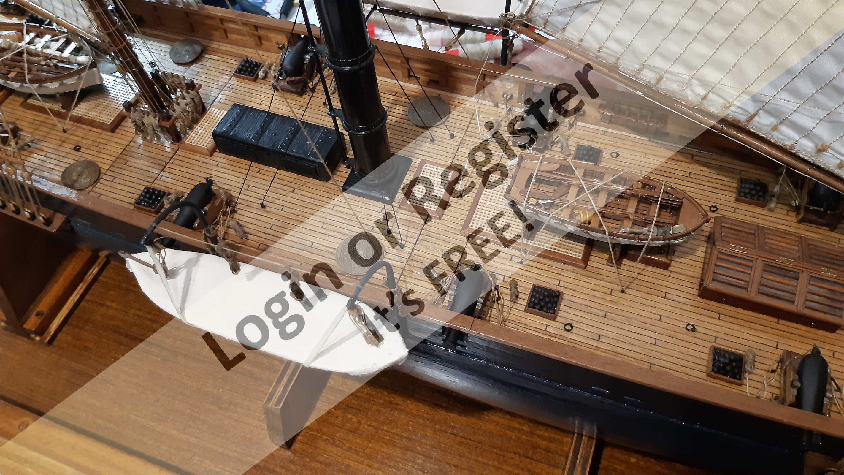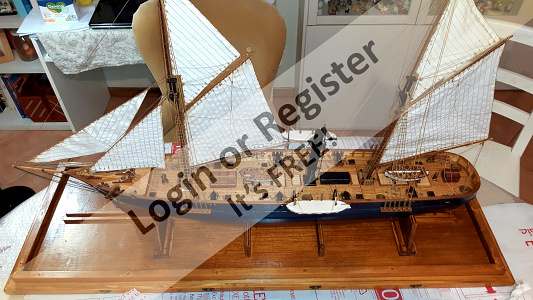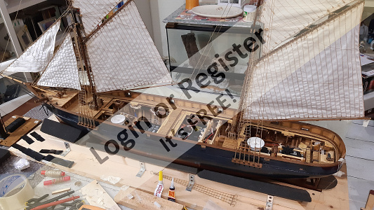 In addition to the hull, the following parts were built from scratch (with drawings and independent design inspired by images and videos): masts (including the cheek, mast cap, asthead, cross tress, spars, moorings, spreaders, gooseneck [parrel, boom claw, jae-rope]), both standing and running rigging, sails, ladders between the two decks, davits, compass, rudder, propeller shaft, pegs, gratings, skylight, cannons, lifeboats, lifeboat davits, anchor bit, large cleats, funnel and rear structure, baskets, sail hoops, rings, and padeyes, fife rail, cathead and pin rail.