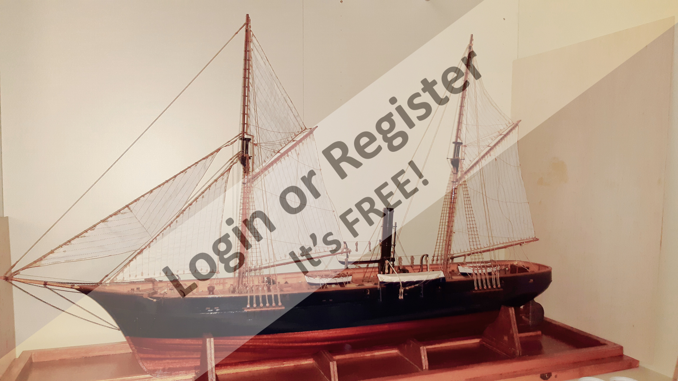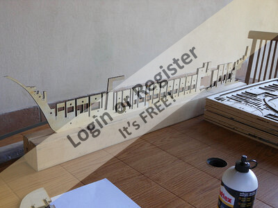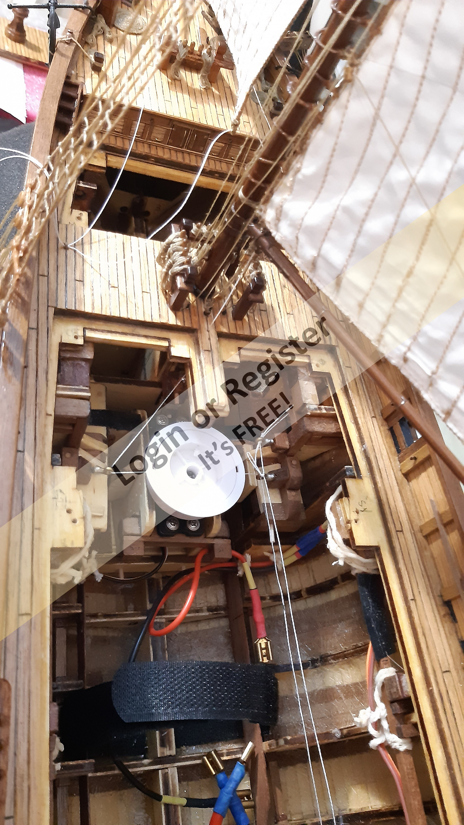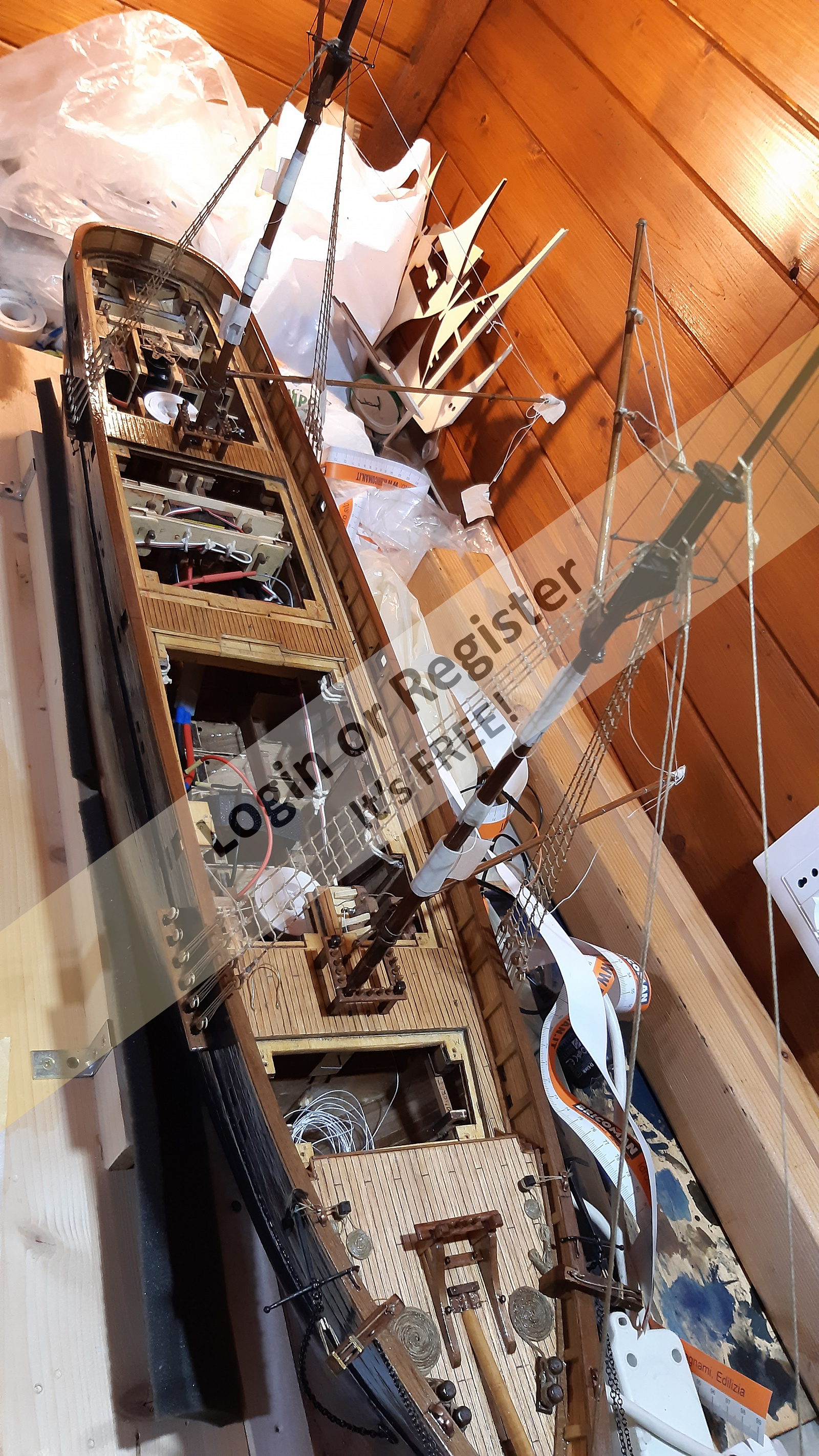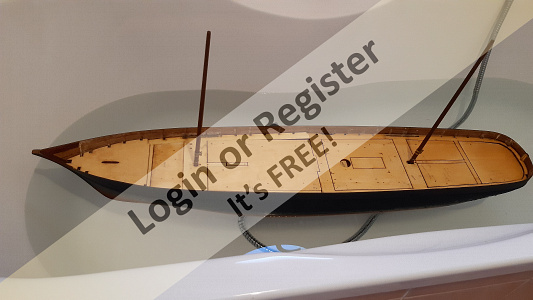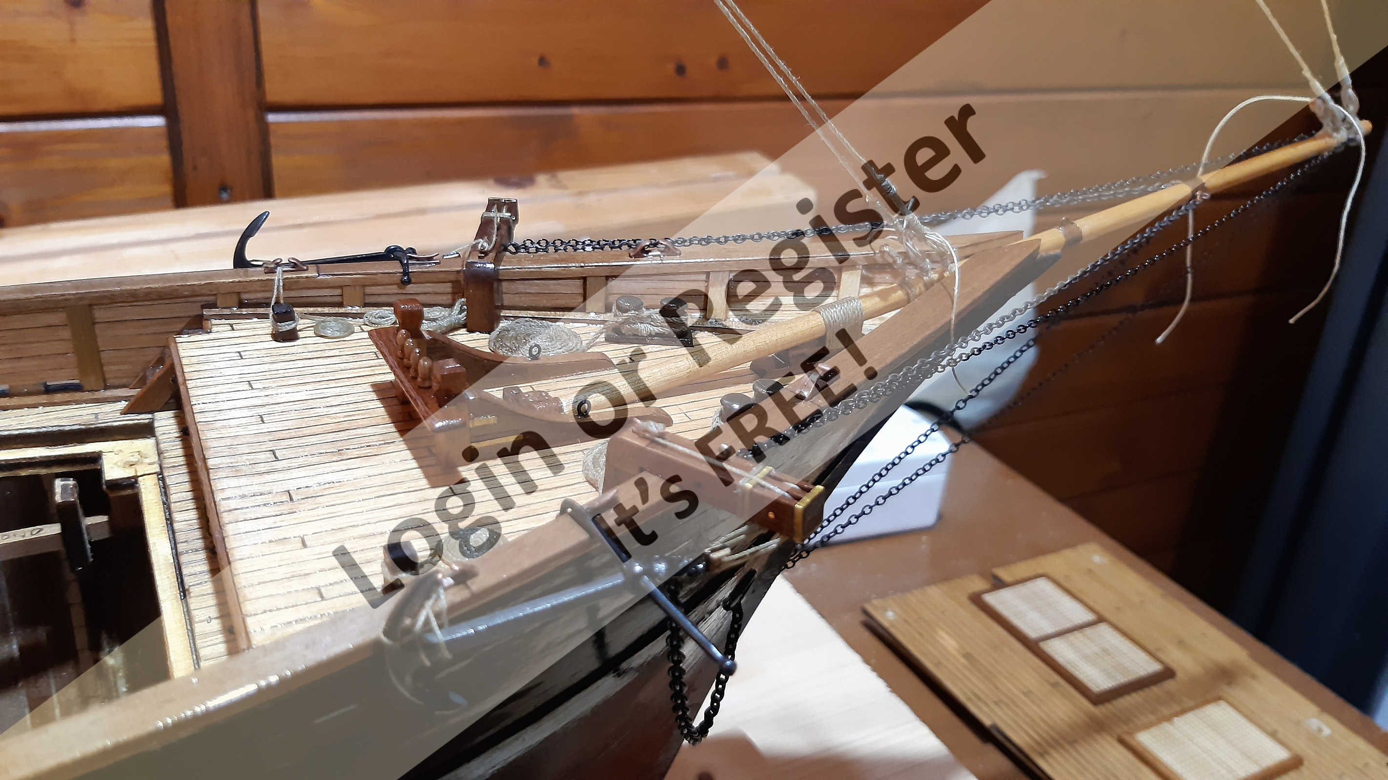 In addition to the hull, the following parts were built from scratch (with drawings and independent design inspired by images and videos): masts (including the cheek, mast cap, asthead, cross tress, spars, moorings, spreaders, gooseneck [parrel, boom claw, jae-rope]), both standing and running rigging, sails, ladders between the two decks, davits, compass, rudder, propeller shaft, pegs, gratings, skylight, cannons, lifeboats, lifeboat davits, anchor bit, large cleats, funnel and rear structure, baskets, sail hoops, rings, and padeyes, fife rail, cathead and pin rail.