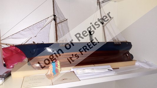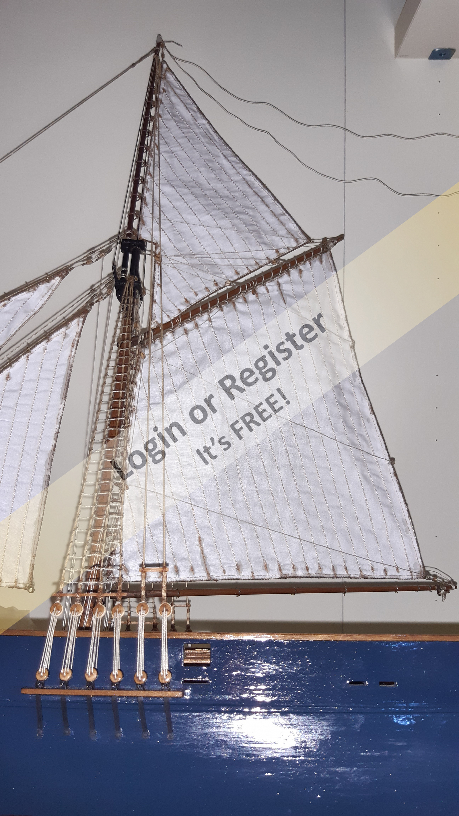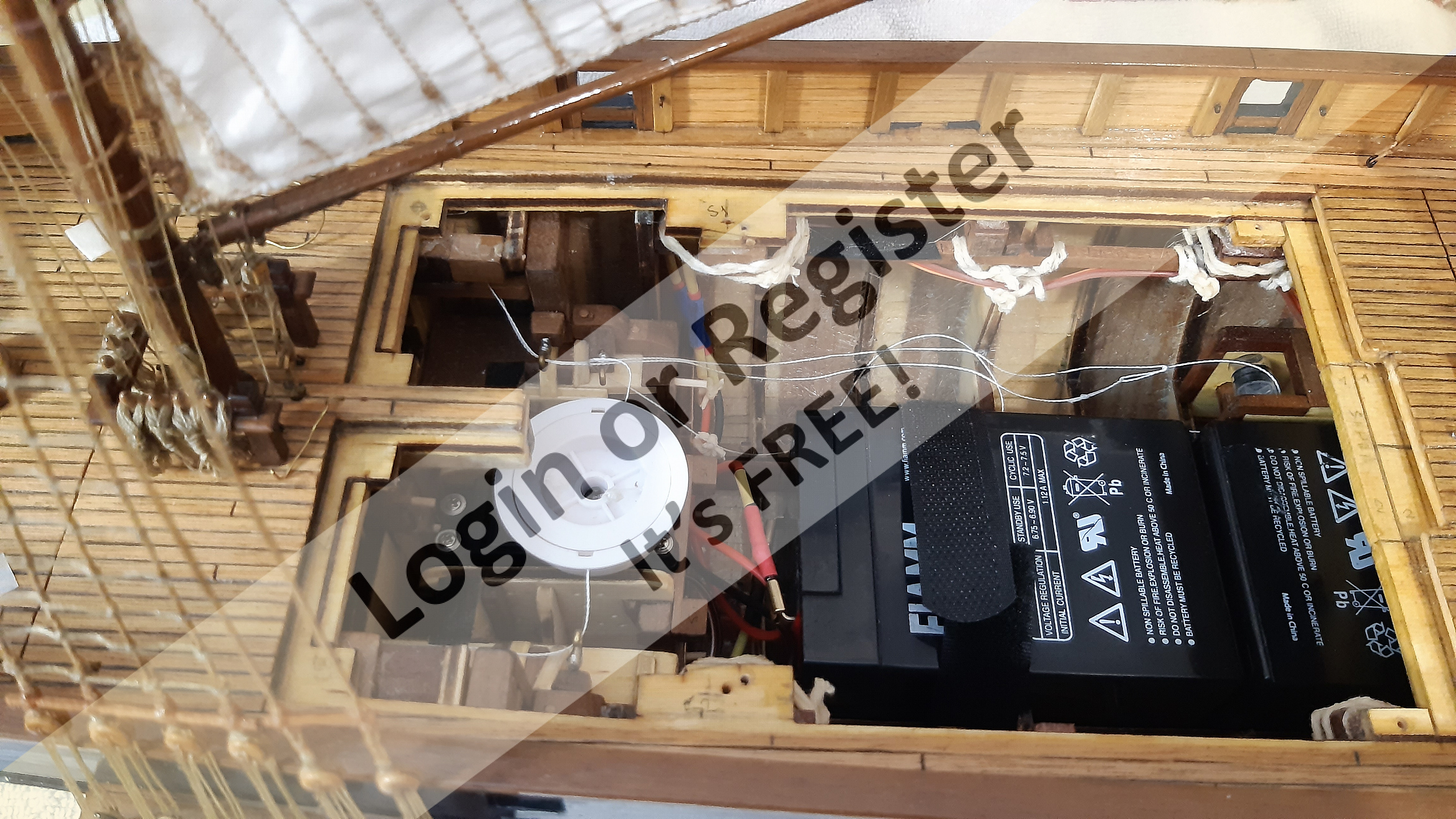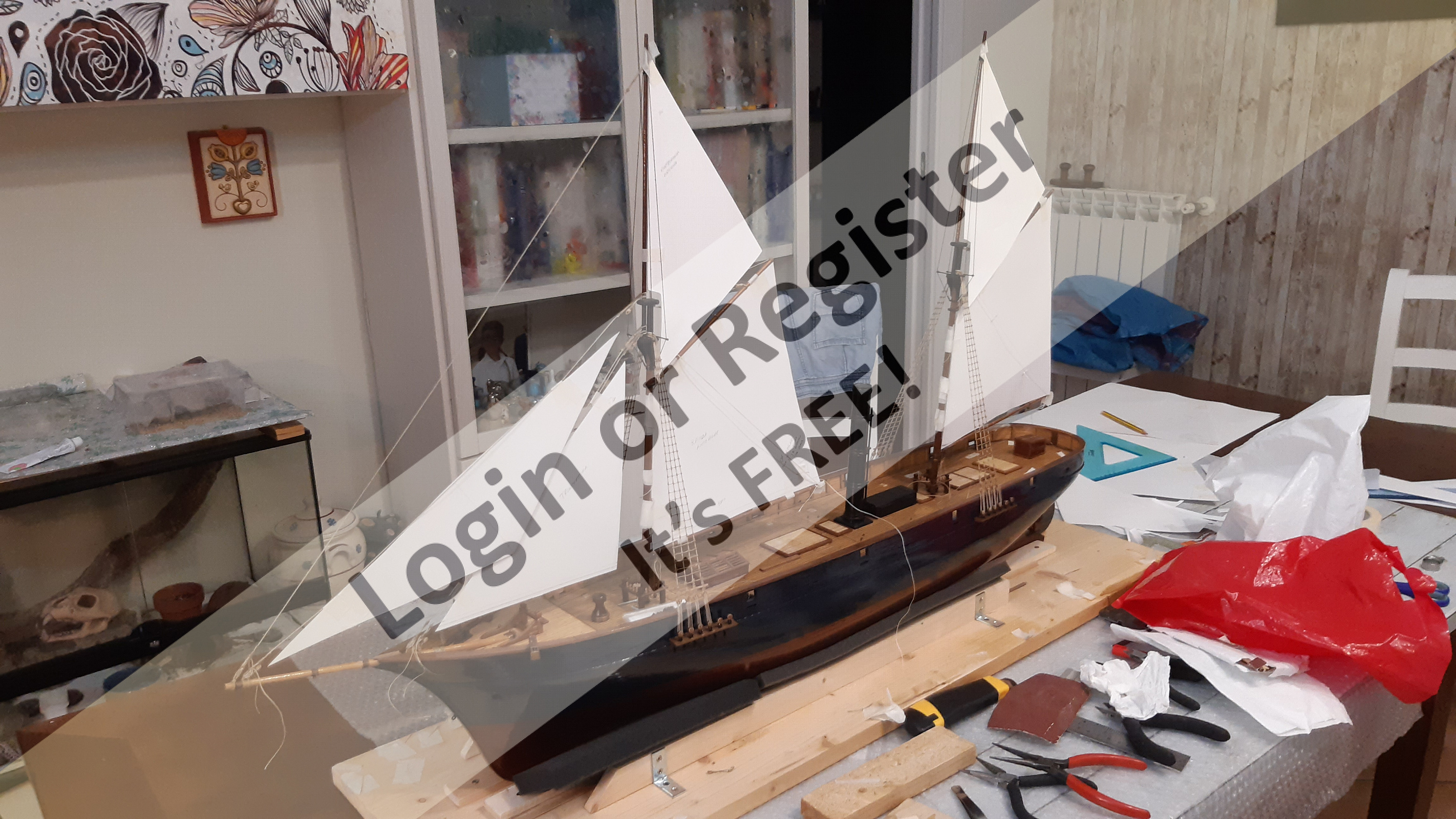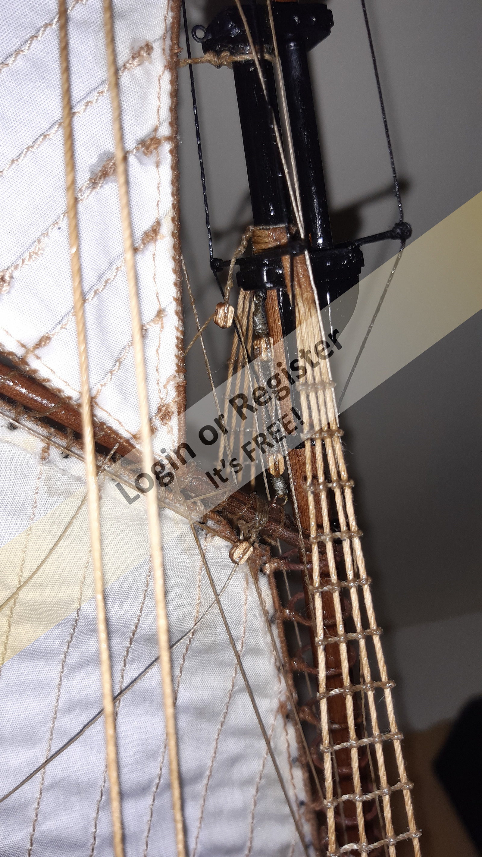 In addition to the hull, the following parts were built from scratch (with drawings and independent design inspired by images and videos): masts (including the cheek, mast cap, asthead, cross tress, spars, moorings, spreaders, gooseneck [parrel, boom claw, jae-rope]), both standing and running rigging, sails, ladders between the two decks, davits, compass, rudder, propeller shaft, pegs, gratings, skylight, cannons, lifeboats, lifeboat davits, anchor bit, large cleats, funnel and rear structure, baskets, sail hoops, rings, and padeyes, fife rail, cathead and pin rail.