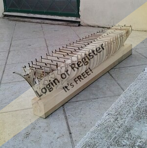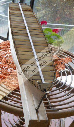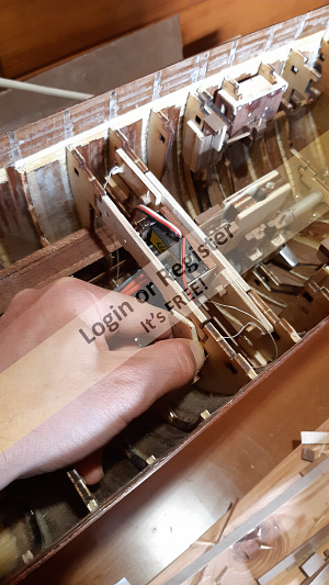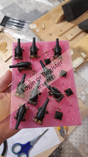 Plastic sheeting (side cranes, hawsehole, gooseneck [parrel, boom claw, jae-rope] for the gaff and reinforcement of other wooden pieces, funnel rings, gun carriages reinforcing the walnut wood)
