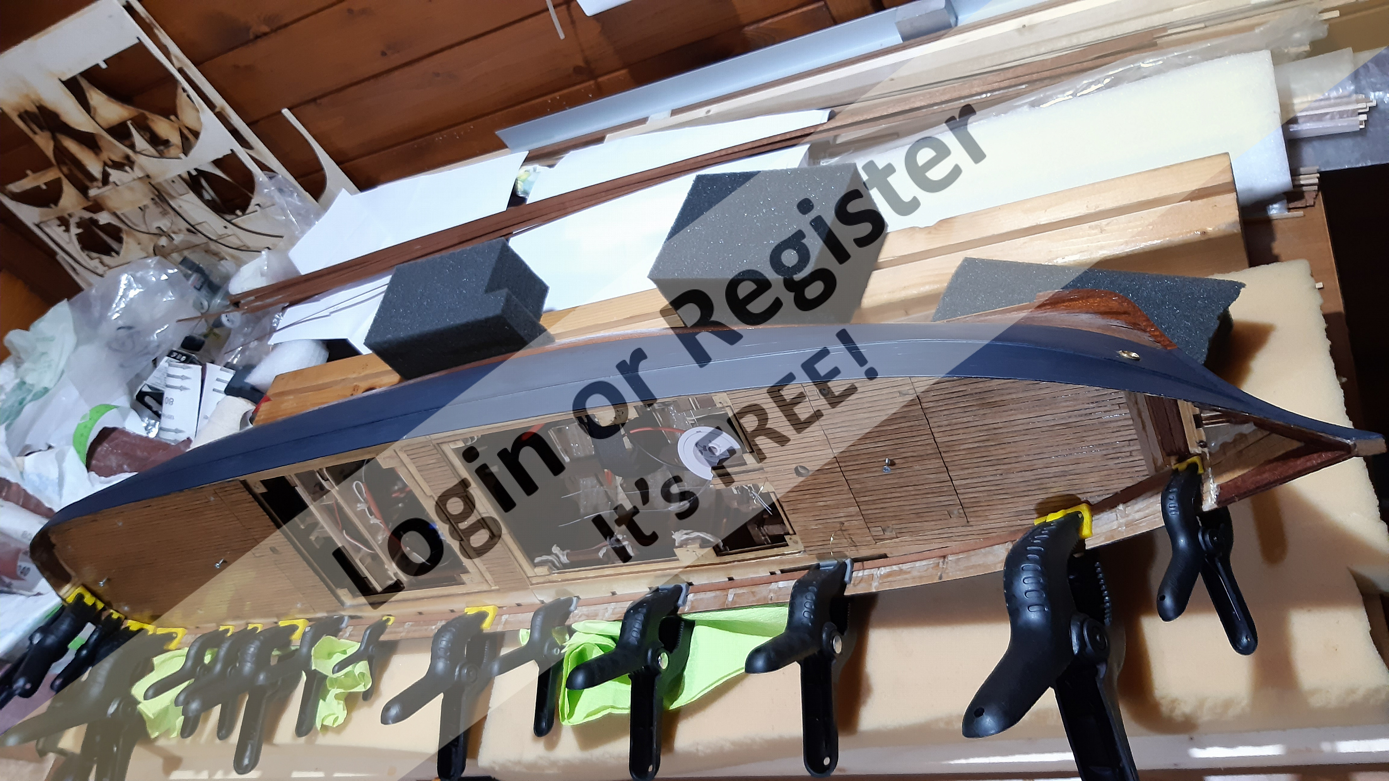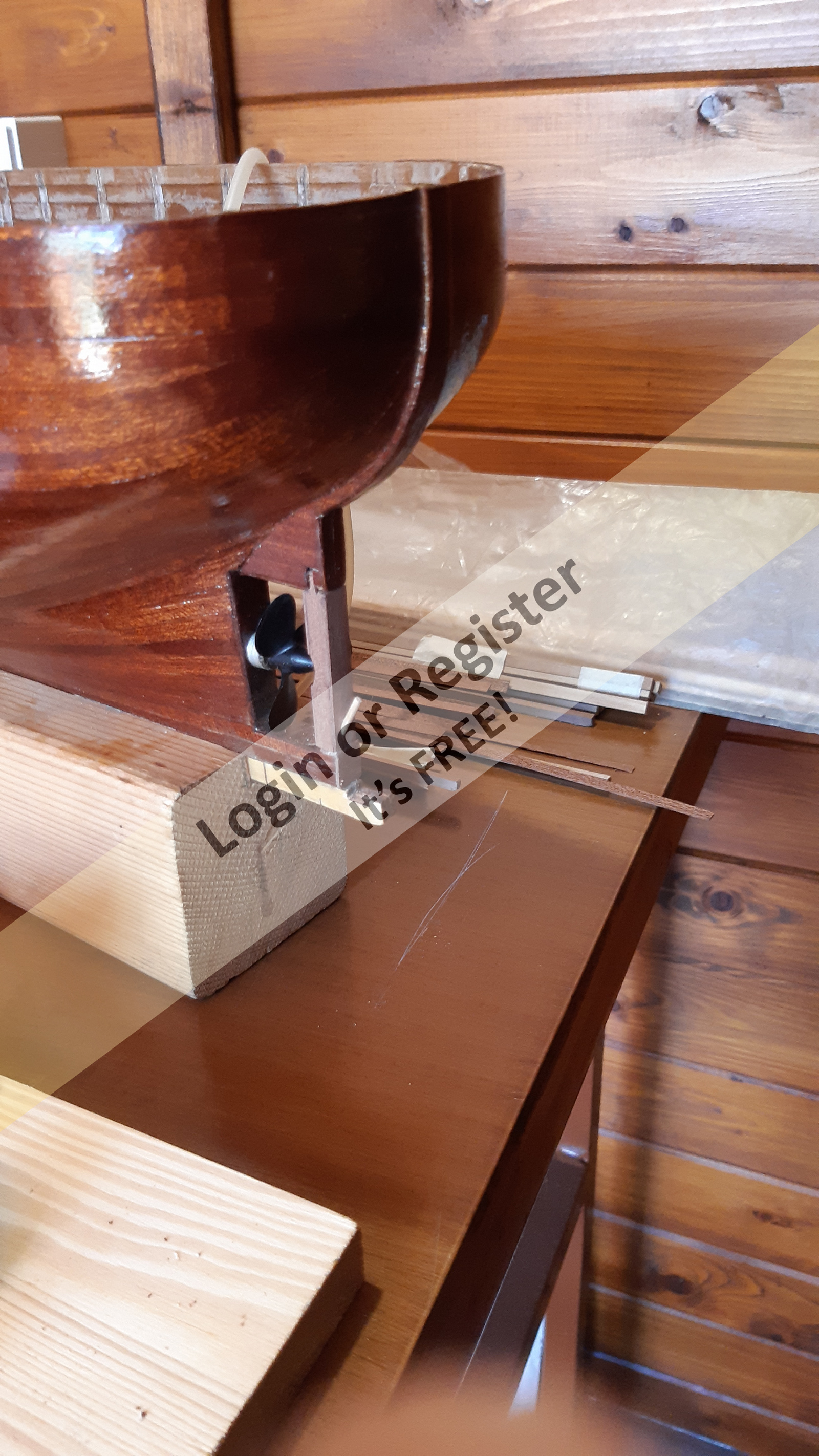 The following components were purchased and already complete: bow winch, anchors, blocks, deadeyes, belay pin, rings, steering wheel, propeller, hawsehole, cleats, and fairleads.