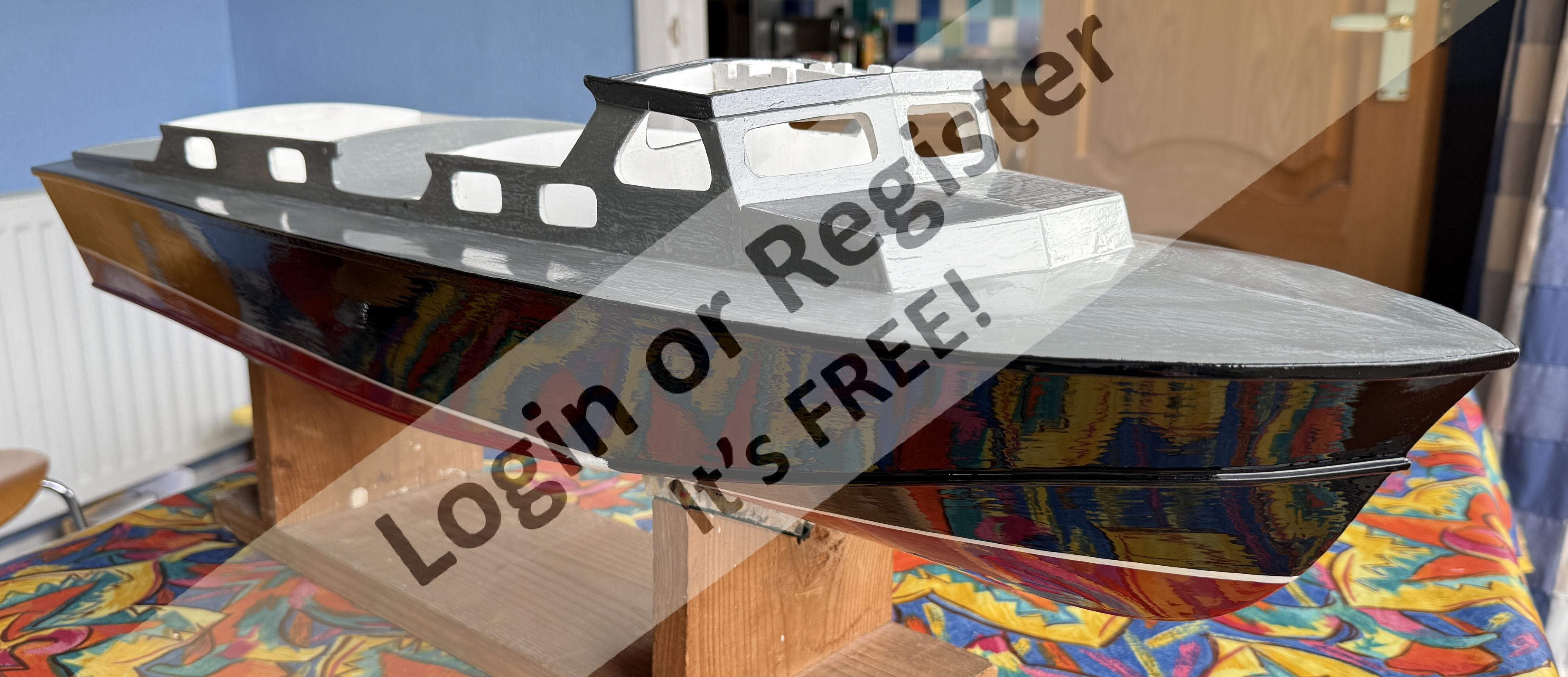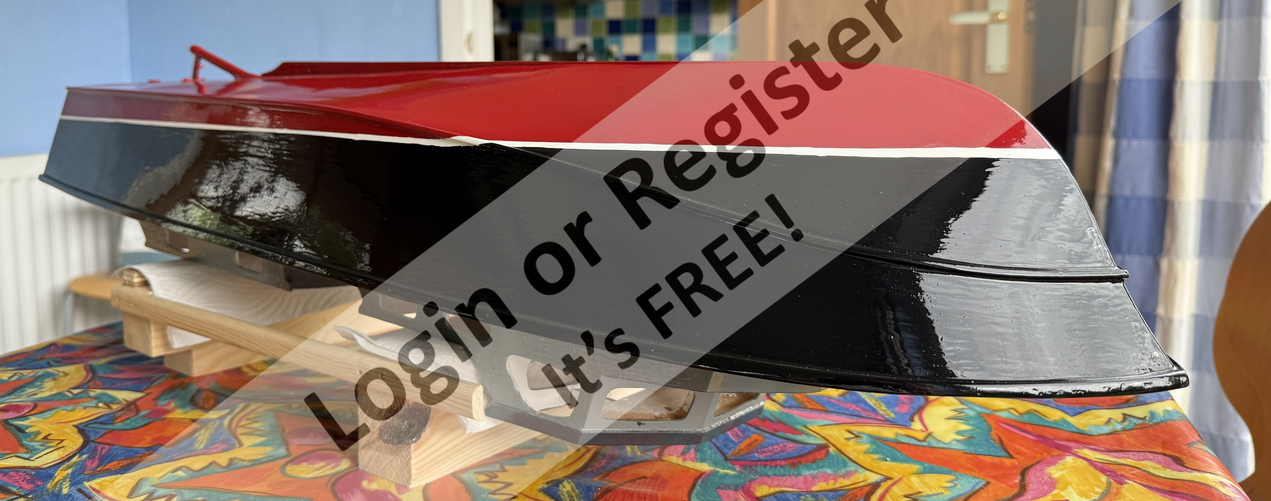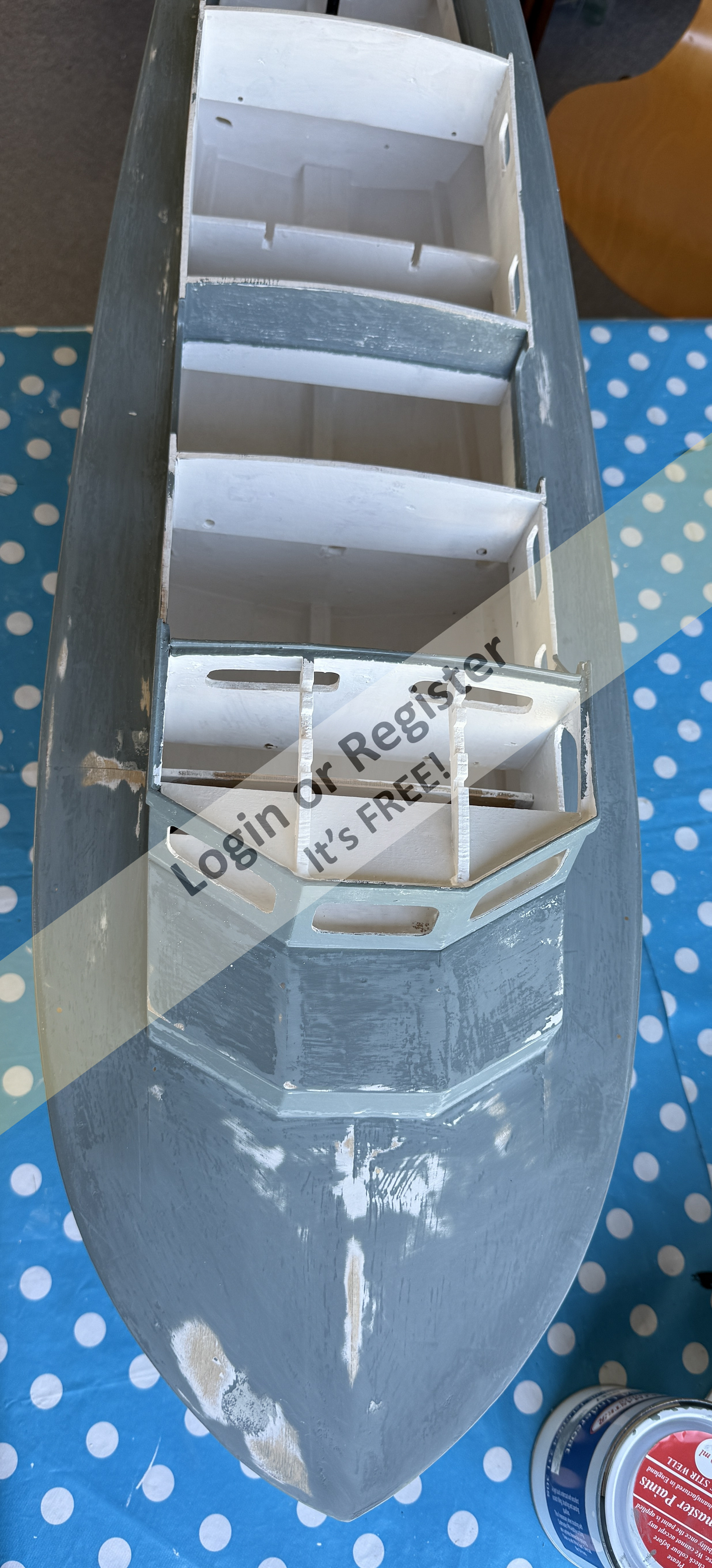 I used Johnstones Trade Wood Primer and Grey Undercoat for the base layers, sanding between each coat to try to get a smooth finish. The hull is painted "Victory Red" and "Black", and the waterline painted white with Craftmaster Signwriting Enamel