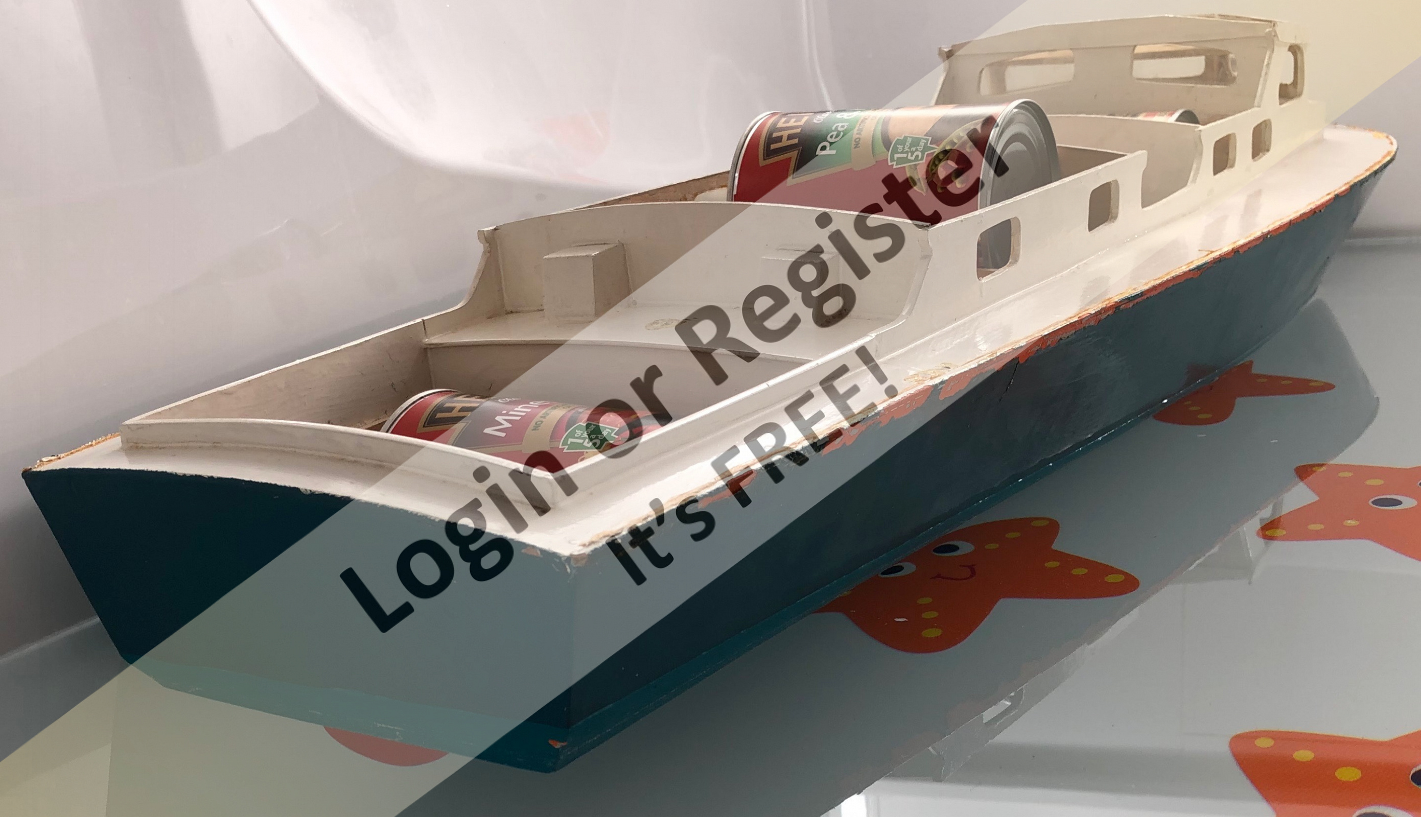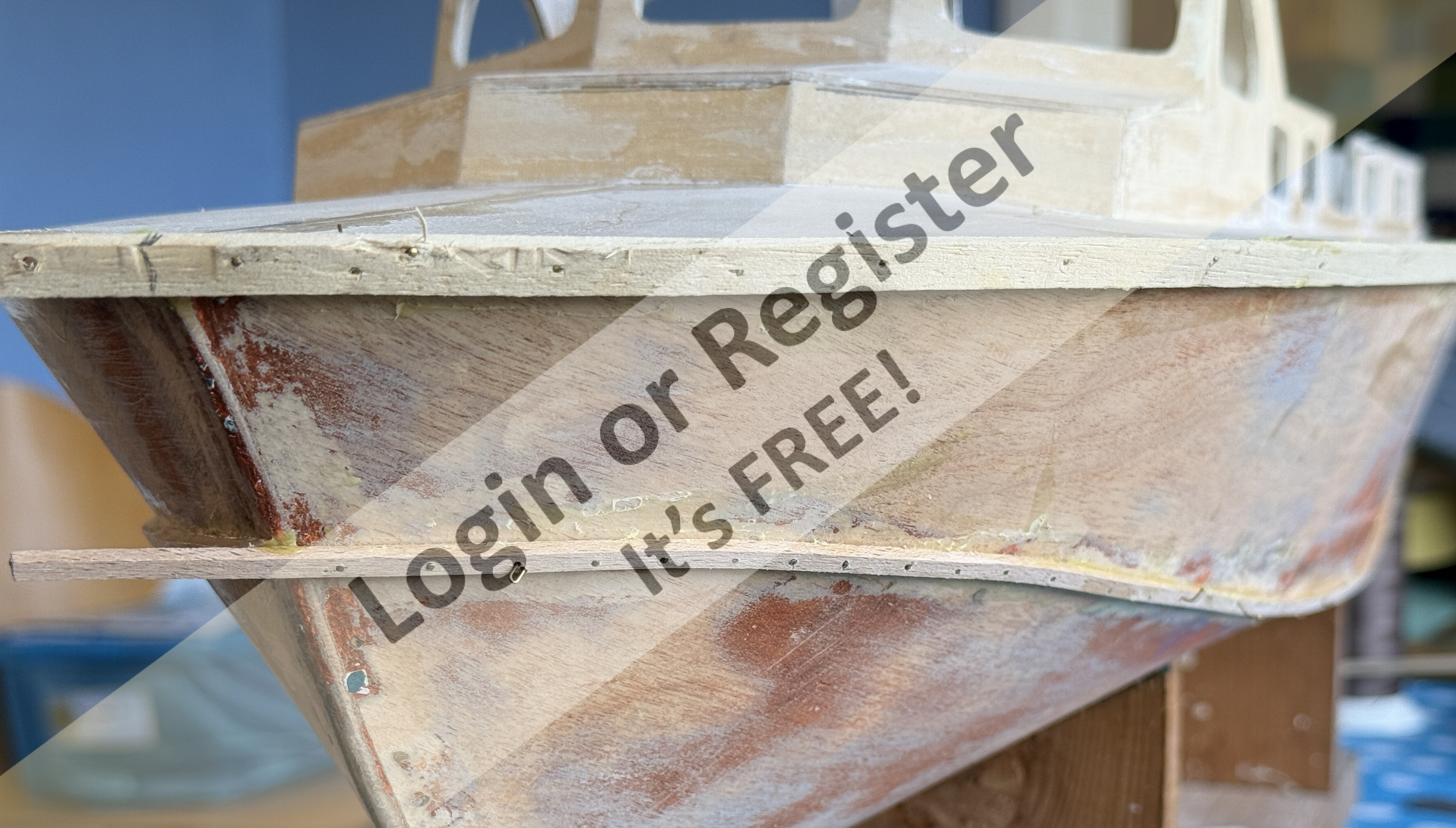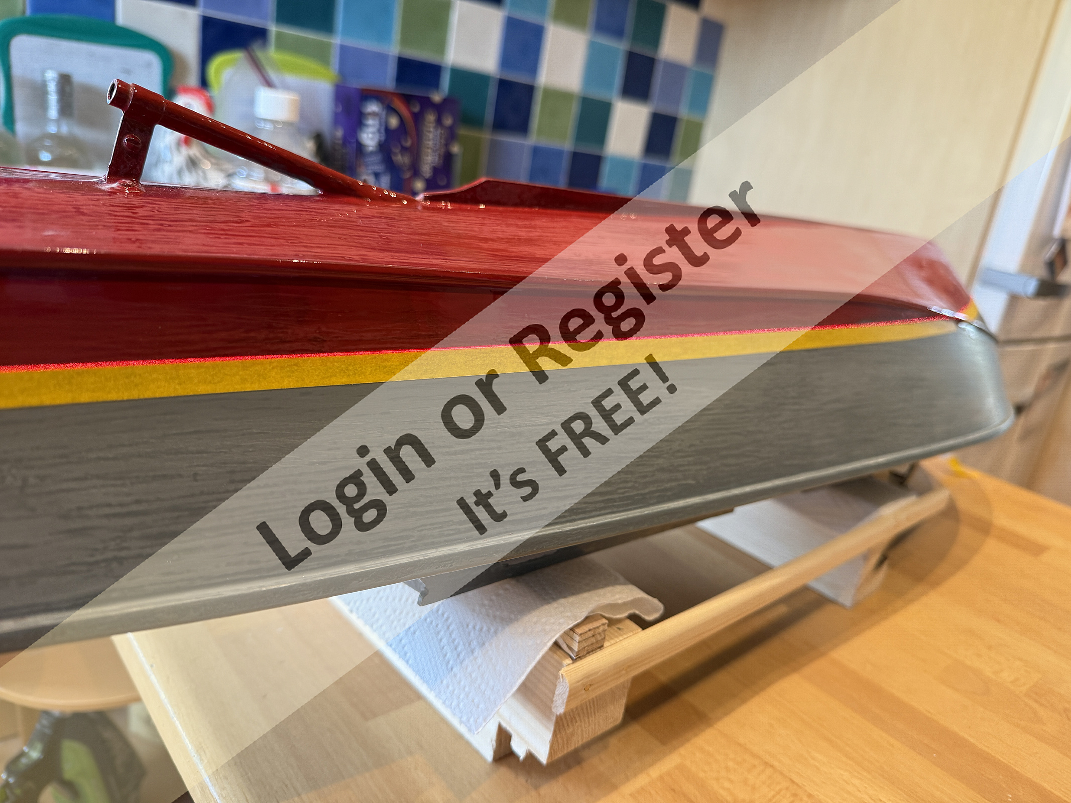 I used Johnstones Trade Wood Primer and Grey Undercoat for the base layers, sanding between each coat to try to get a smooth finish. The hull is painted "Victory Red" and "Black", and the waterline painted white with Craftmaster Signwriting Enamel