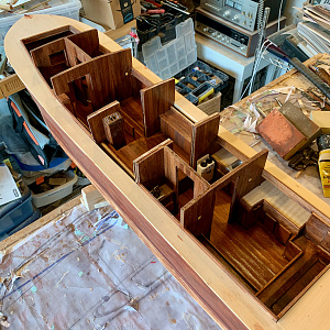 The hull: mainframes were assembled on the keel, and attached to a strongback for planking. Bow, stern, and keel blocks were Installed. The whole thing Is sanded to shape, sins filled, epoxied, and painted. Currently where I am now.