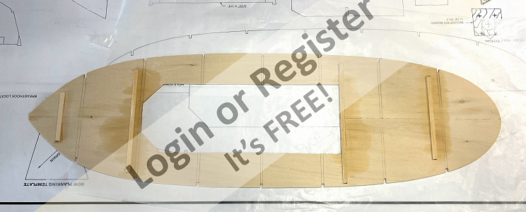 After fairing the hull to establish a smooth, continuous load path for the planking, the next step is to fabricate and install the hull panels. I began by cutting the planking sections from the supplied 3/32" sheet stock, ensuring that the wood grain ran vertically.