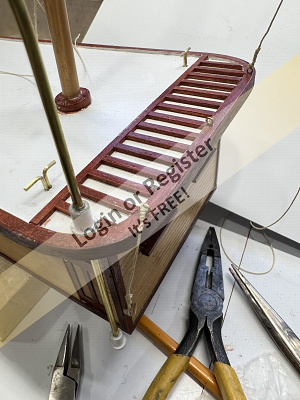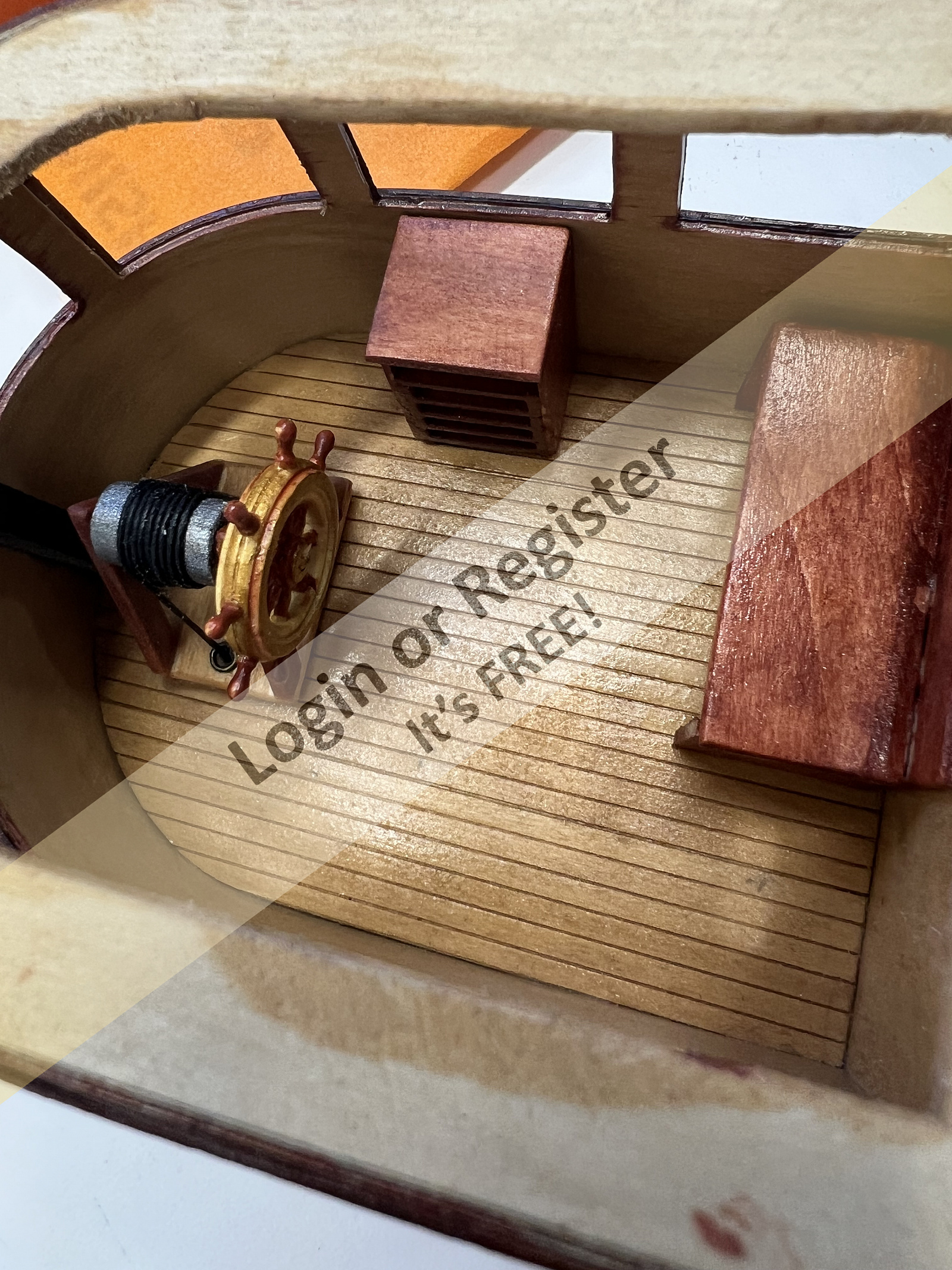 The next morning, I decided a new method was needed. My solution was to glue each assembled wall-and-window unit onto an ultra-thin sheet of mahogany veneer I had available at work. This instantly transformed the pieces into strong, rigid components while also giving the pilothouse interior a rich mahogany finishโan unexpected but very attractive improvement.