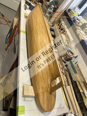 These were faired carefully and then paneled in the same mannerโstarting at the bow and cutting each section with the grain orientation indicated in the plans.