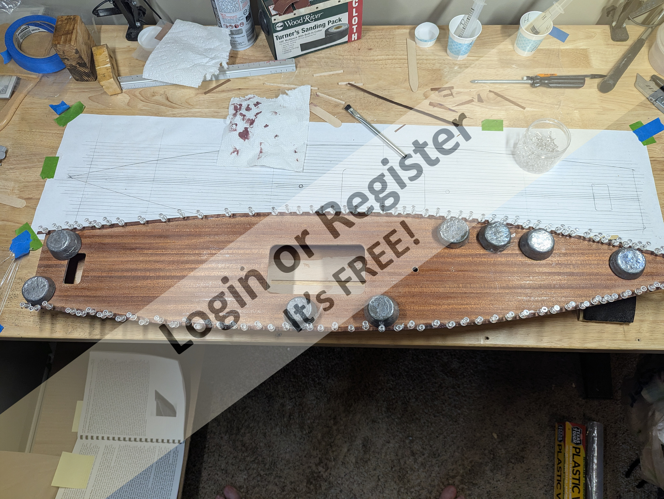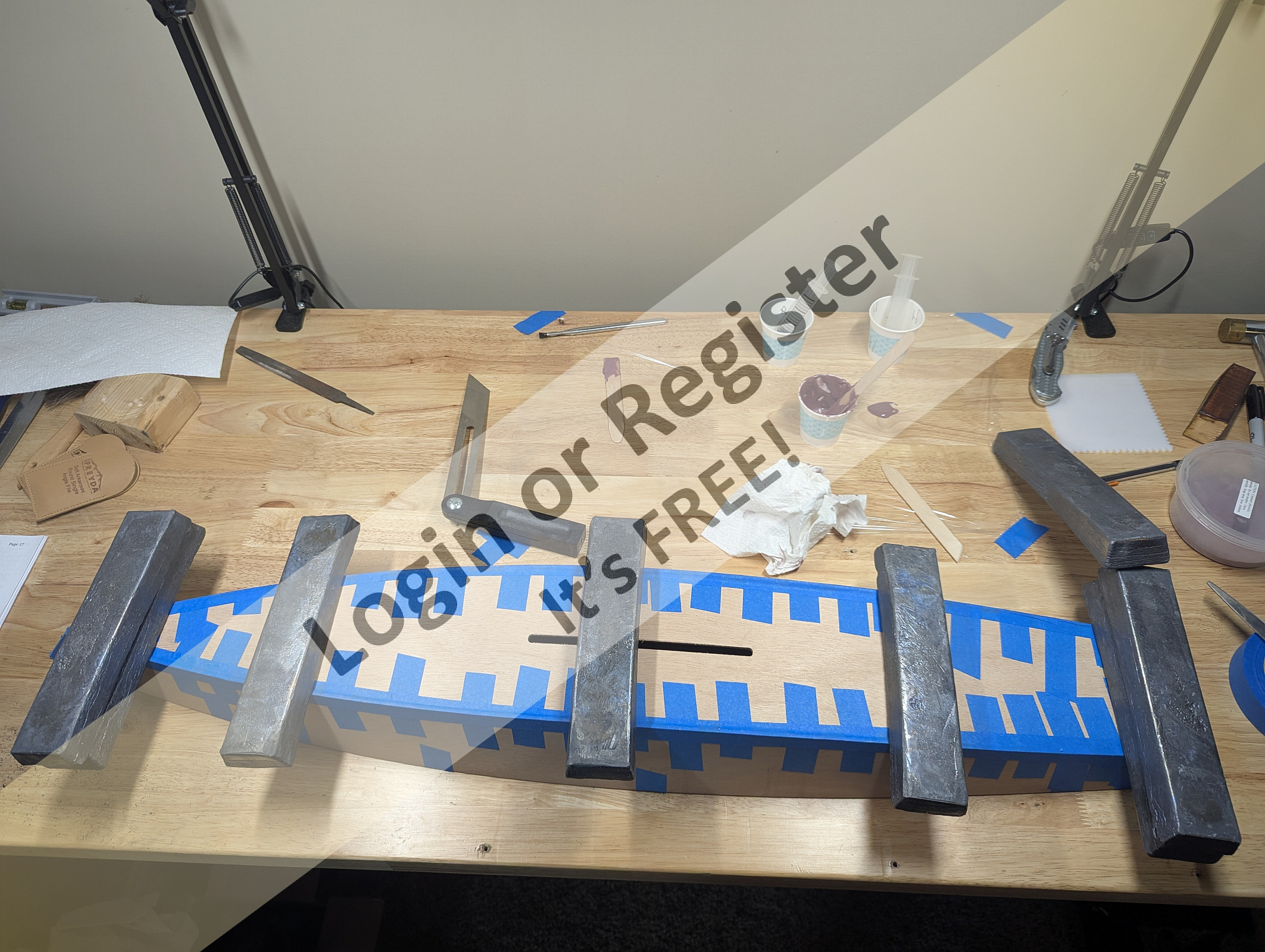 I placed some weights on top and used a bevel tool to make sure both sides had the same angle and the hull wouldn't end up with a twist. I had to use a clamp to add a small torque towards the stern to straighten things out. Then everything set overnight.