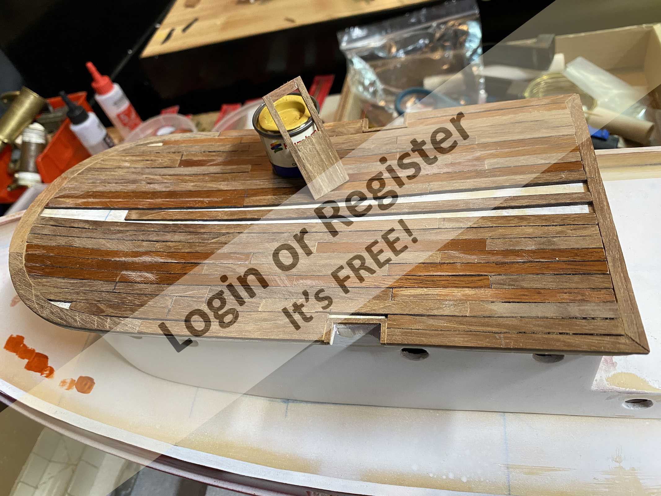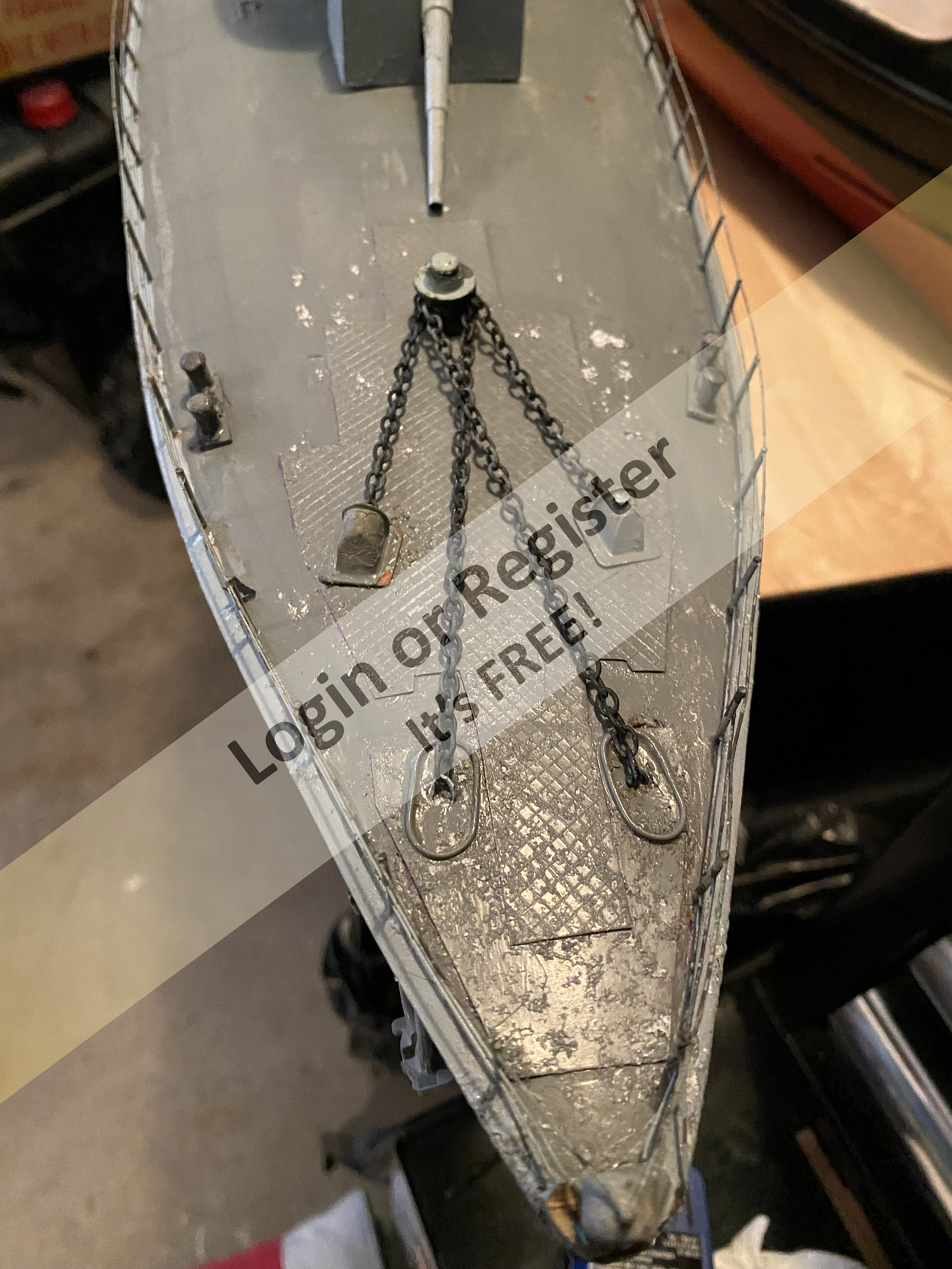 Hello all, a little more progress today. Finished installing the wood decking, just need to sand and seal it. Got the bottom painted today and did some work on the grating at the stern of the tug. Will be painting the sides of the hull black in a day or so.