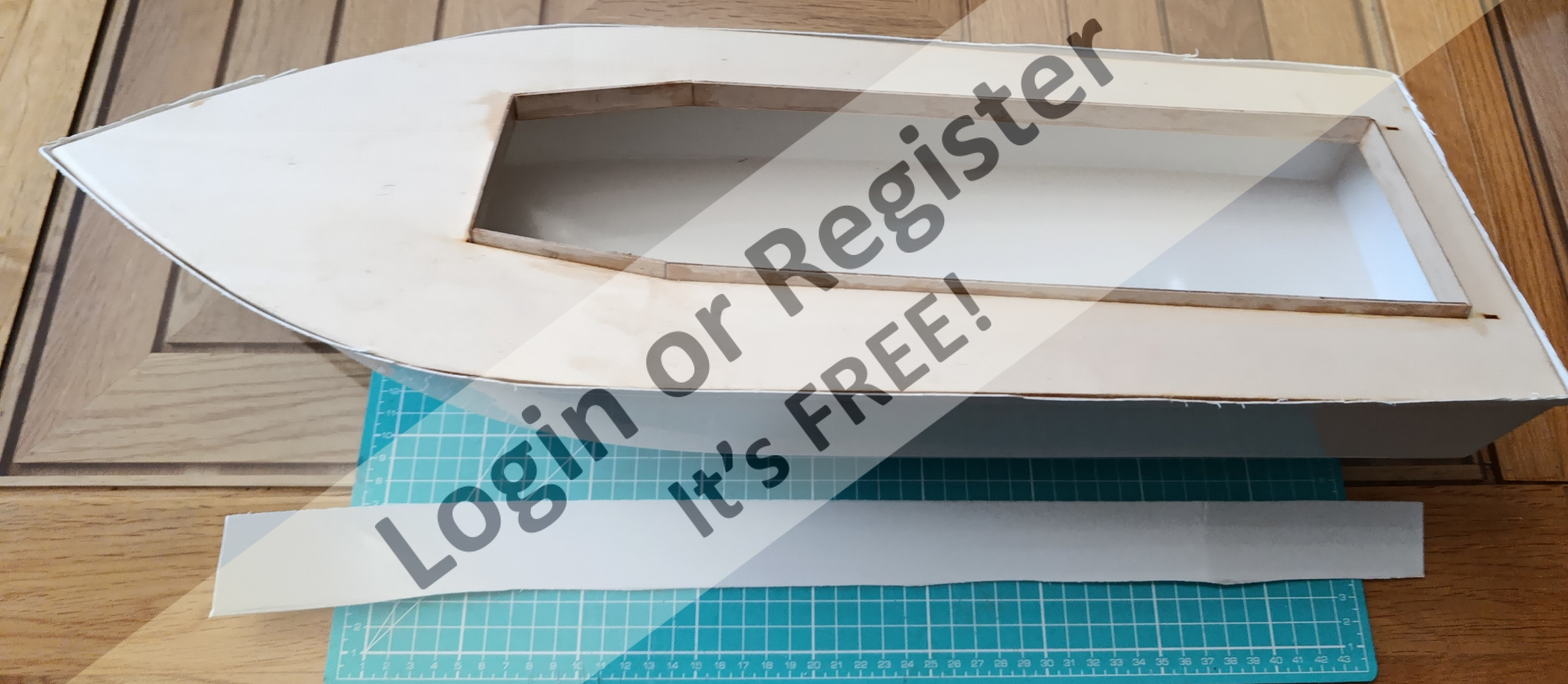 The ABS hull comes with about 1 1/4" (about 300mm) extra height above the deck level which needs cutting down to be about 2mm above the temporary fitted deck level. This wasn't that easy but in the end I used a pair of tin snips to cut it which proved to be better than using a Stanley Knife. I have drilled and filed the holes in the ABS hull for the prop shaft tube and rudder tube. I've now assembled the deck coaming, motor mount, battery box and supports for the rudder tube. Next job is to waterproof the deck on both sides, and all the other assembled plywood parts. Having seen another blog, I've decided to strengthen the wood around the rudder tube by using an offcut from the wood provided for the boat stand. I will smooth the edges when the glue has set!