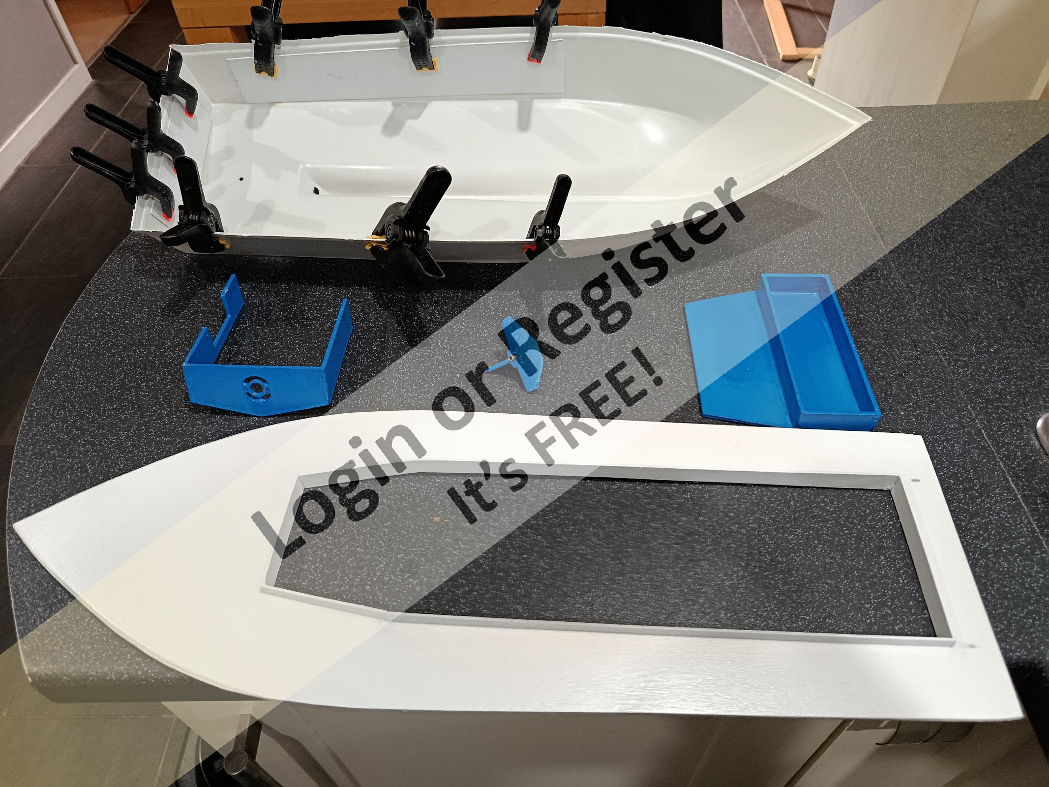 Slow progress as I've been dragged into doing some decorating! Anyway the internal motor mount, battery box, and rudder post have had 3 coats of sanding sealer and 3 coats of blue spray paint. I've also on the advice of Chum, I've added some strengthening to the ABS hull using 1.5mm plastikcard and hard plastic glue which smells like contact glue!