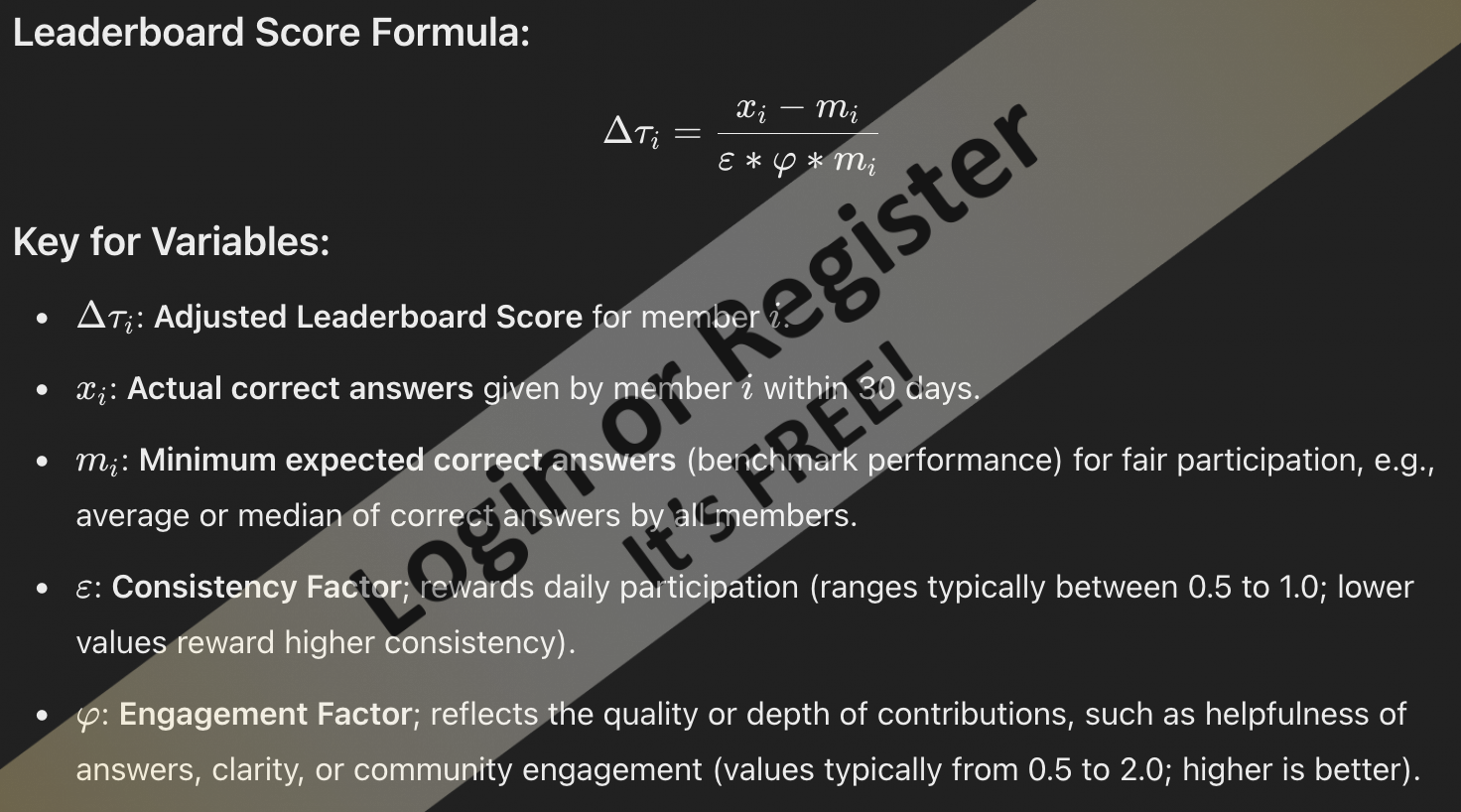 @SimpleSailer, what would you expect to happen if you only answer 1 question in the last 30 days, and it was correct? To keep you at 100% all month? I think we'd end up with a leader board full of members only answering the questions they know for certain... tried to solve this tricky one a few times ๐