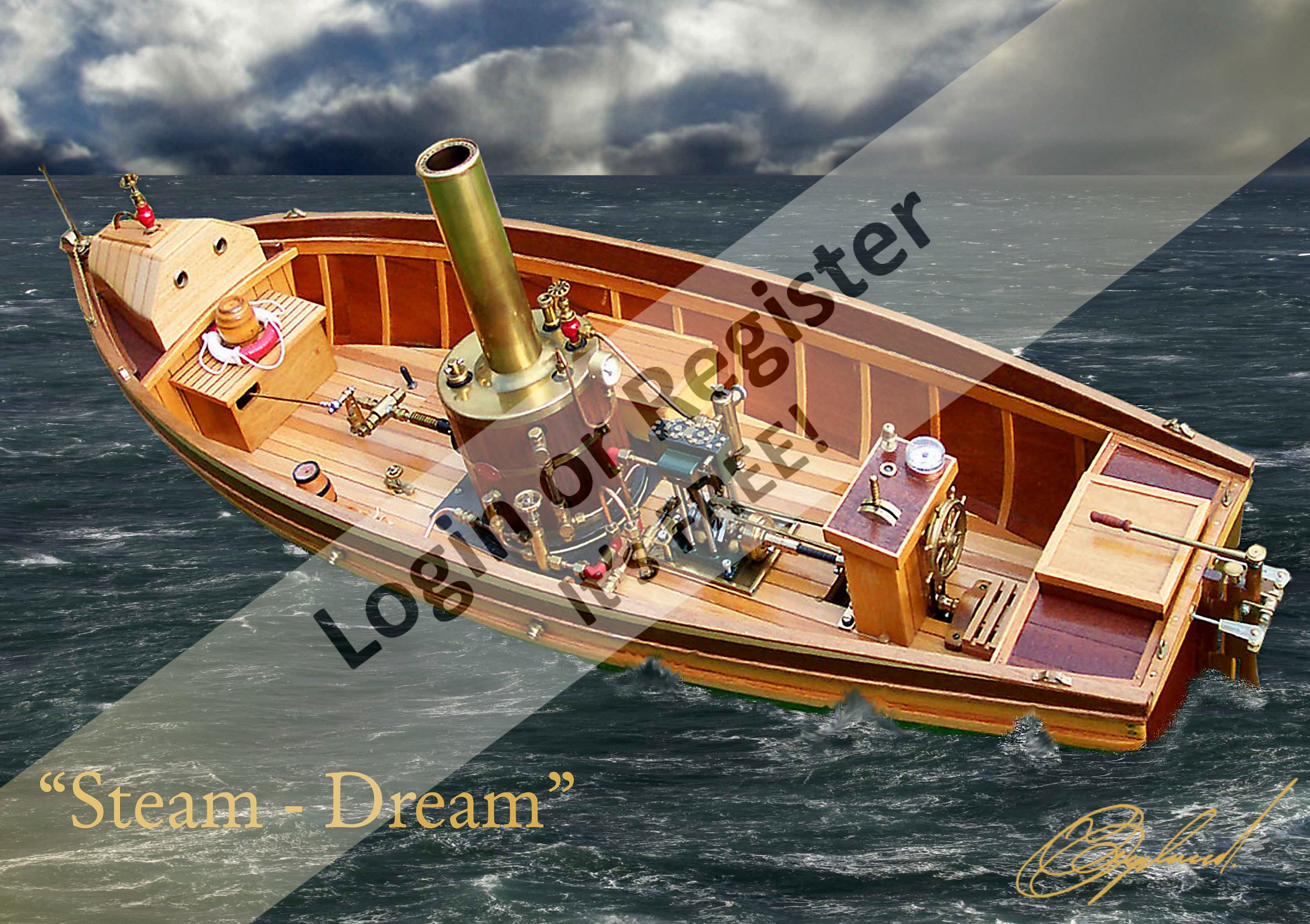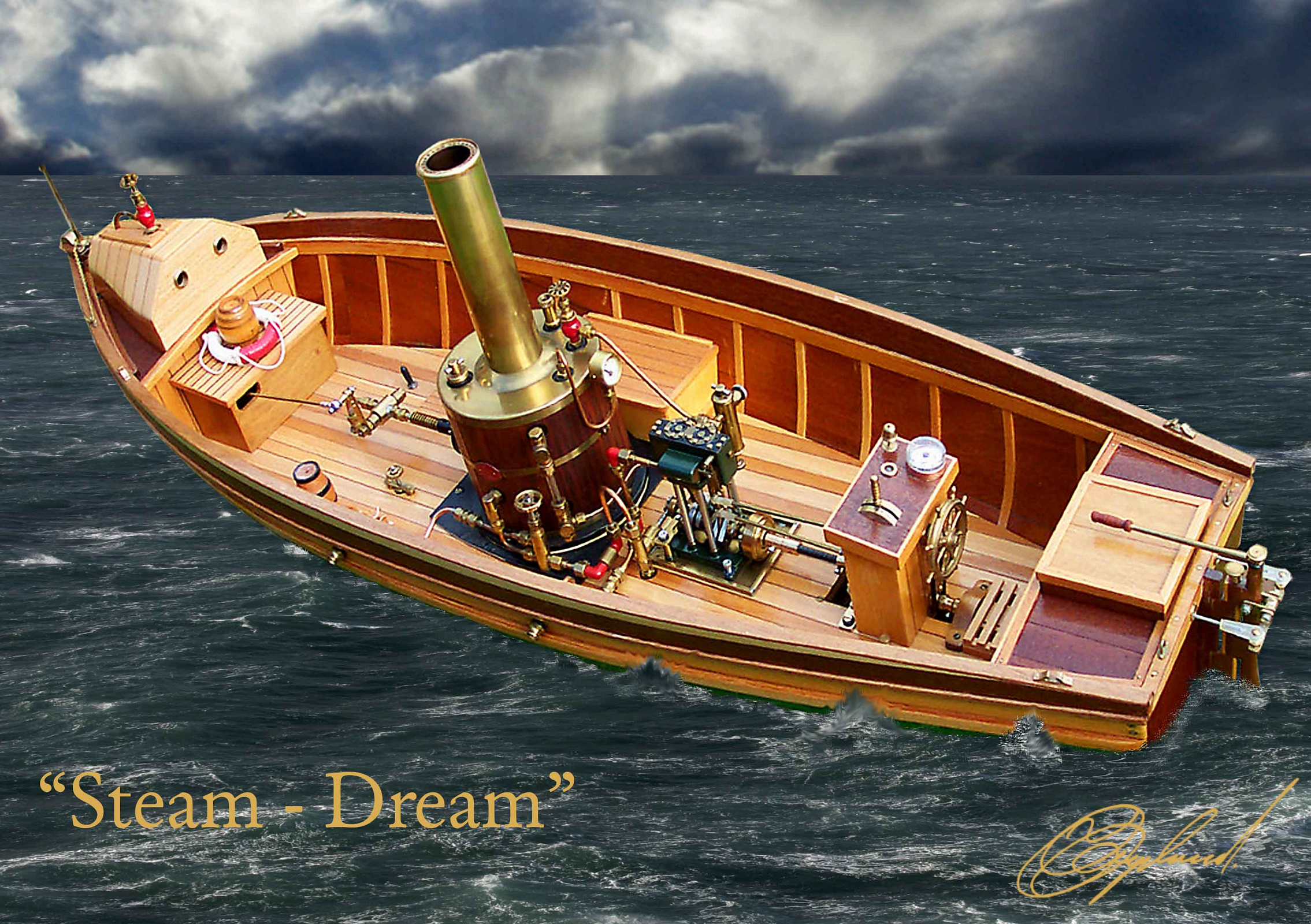 I decided to build an open steam-boat to have the boiler and piston valve engine on show, all that polished copper and brass should be on show and not hidden away, this hull is clinker-built to my own design. (Motor: Maxwell Hemmings Caton) (ESC: servo controlled) (9/10)