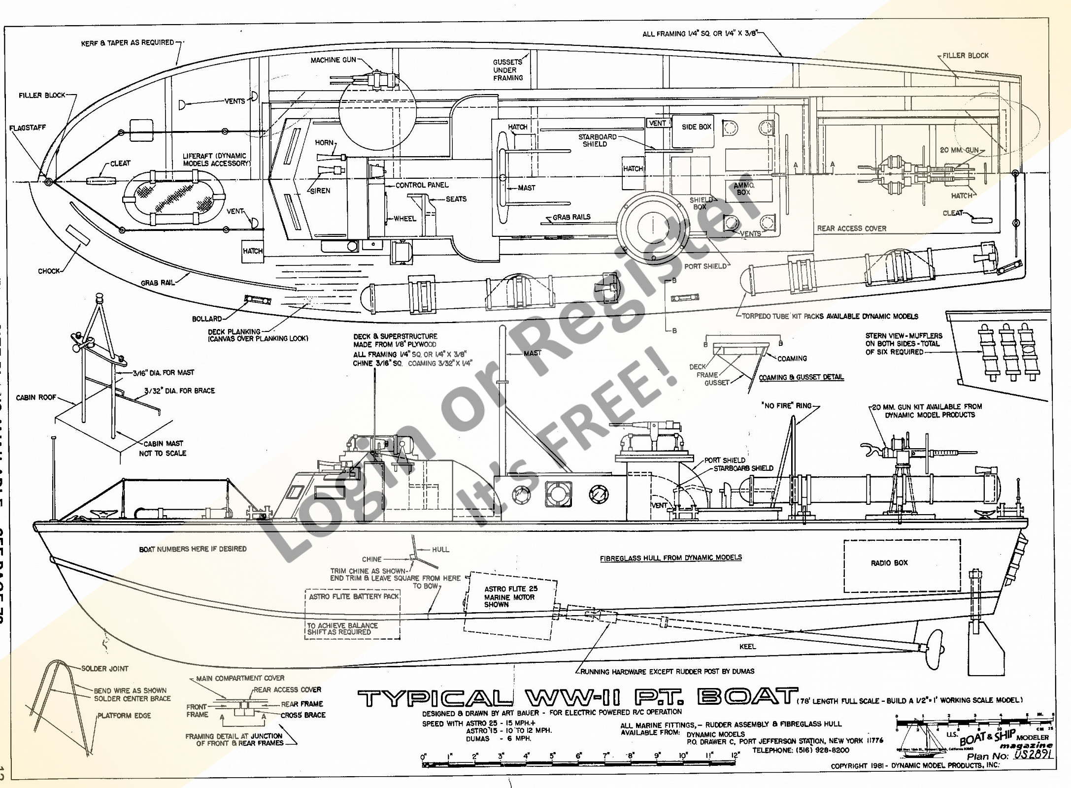 My American Enterprise build got me hooked on model boat magazines. The magazine of choice for me was that classic American publication, Scale Ship Modeler and Scale Model Warship. I still have a shelf with these magazines, long out of publication but they are still awesome to glance through and re-read. When I got the January 1982 issue of Scale Ship from my news stand, I found a written article with plans to build a Higgins PT boat as well as an advertising write-up in their โCrows Nestโ section about the โBig New PT Boat hull by Dynamic Modelsโ. The PT boat appealed to me but I was never a fan of the Higgins, and wanted to do something closer to an Elco. This ad and that article hooked me on trying a military model, not knowing that this would turn into a major long-term build.