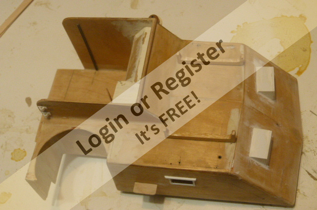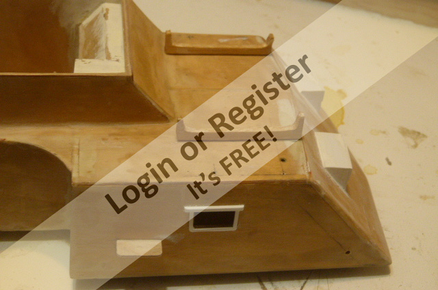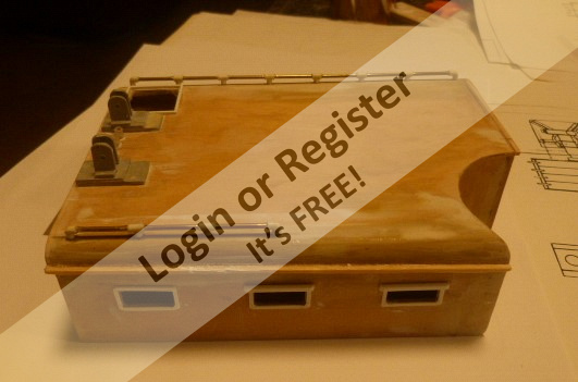 The rear accessories platform was built next based on a flat pattern drawn from Al Rossโs drawing details. I made a small error in locating the engine room vent, but epoxy and micro balloons were a good fix for this error. The original plan was to open up the deck below this opening and add a CPU muffin fan for air flow. The removeable deck and cabin details fit really nice.