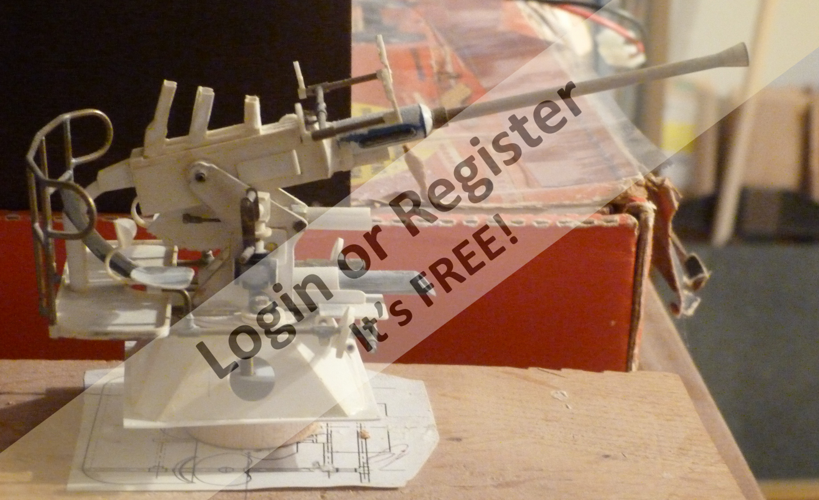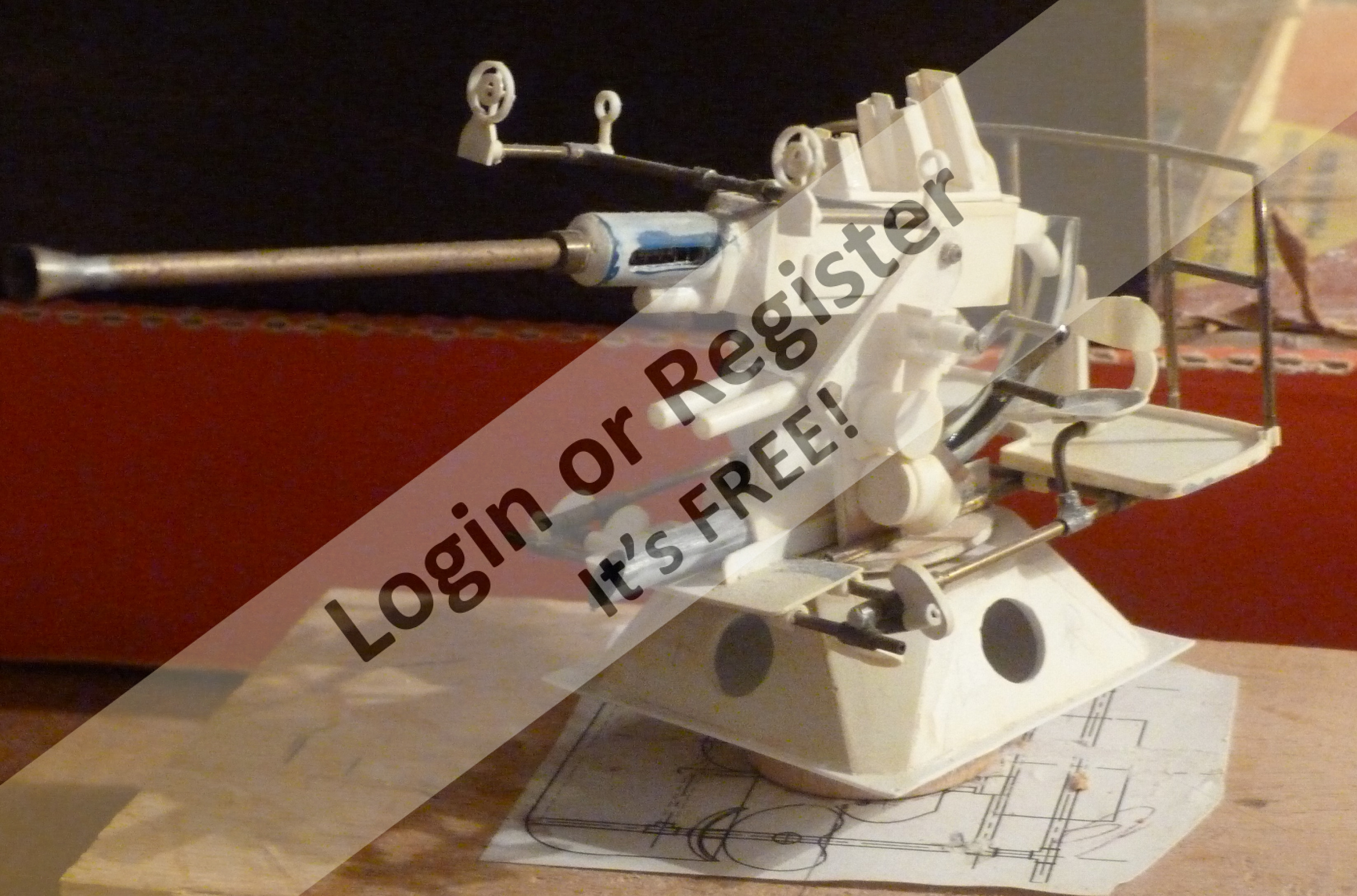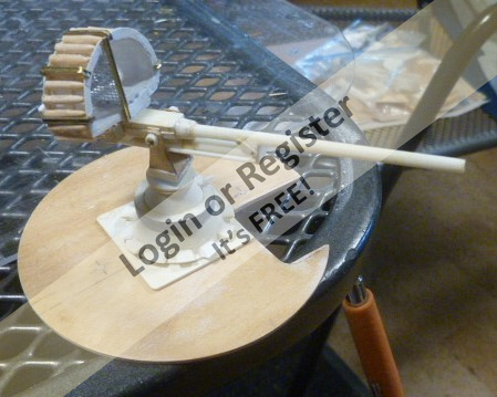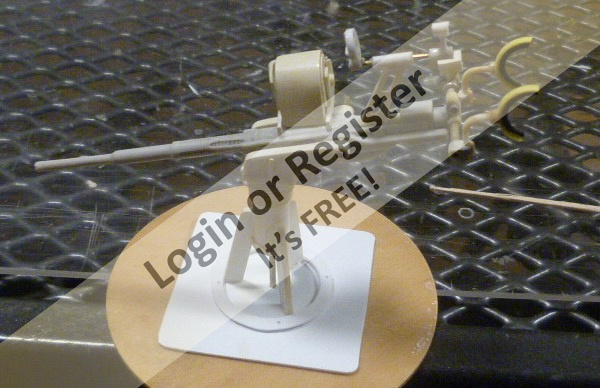 The first gun built was the single 40mm Bofors Cannon which mounts on the rear deck access. This was a real beast to do but while researching I found John Drainโs site PT Boats.com and used his original build as a guide to model mine after. I also had elevation and top views of this gun from reference sources that aided in creating this weapon. Using my reference sources I drew the gun full sized and scaled it down to 1/24 to create parts for the model. Some detail I know was neglected. I have tried to minimize weight where possible, so metal parts used by John Drain on his gun were minimized and the gun was built mainly from styrene and brass tube. I used methylene chloride (toxic stuff!) to quickly solvent weld most of the styrene parts together.