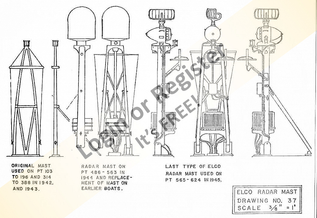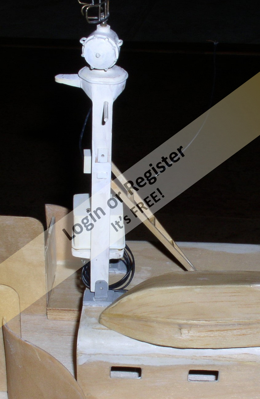 The drawing shows the three masts used on the Elco boats, the one on the right being the subject for my build. I found a few challenges making this part, but my second attempt was successful. I used a micro gear drive, I think made by Robbe or Graupner inside the mast box. A heat shrink linkage joins the brass radar dish with the motor. It rotates at about 30 rpm on a 3 volt power supply. Staggered holes for vertical mast pivots were drilled into the day cabin and the mounts were also staggered on the mast post so it folds down diagonally on the day cabin (when the boat is in port). Like the Bofors, the mast is assembled in numerous pieces so that it can be disassembled for painting.