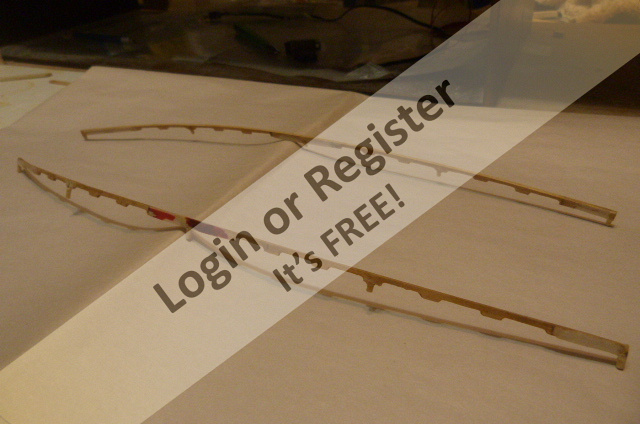 The next thing I did was to use Art Bauerโs guide from the Dynamic catalogue to create the deck support frame . I wanted to make the model so that the deck was arced from side to side and also arced downward in the bow section just like the original Elco boats. At a scale of ยฝโ = 1โthe lack of deck curve would be noticeable. Before making the cross frames I ran ยผโ square strips around the top of the inside edge of the hull to reinforce the fiberglass structure.